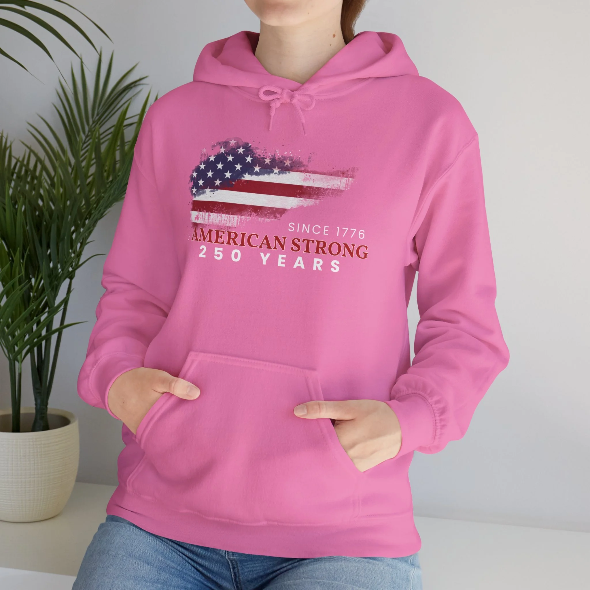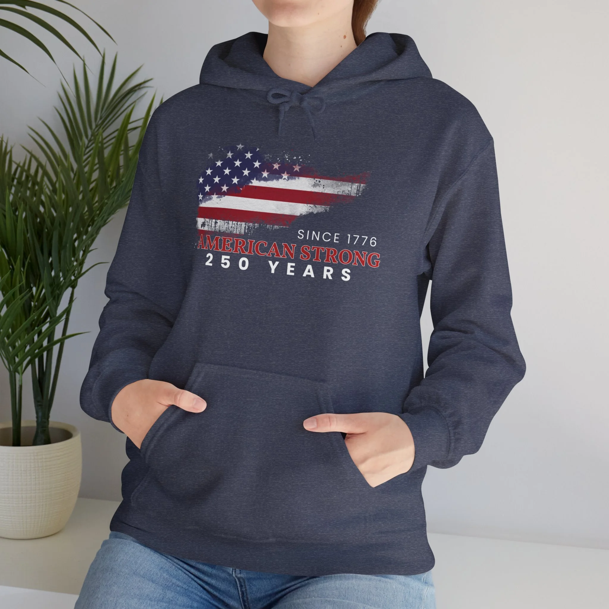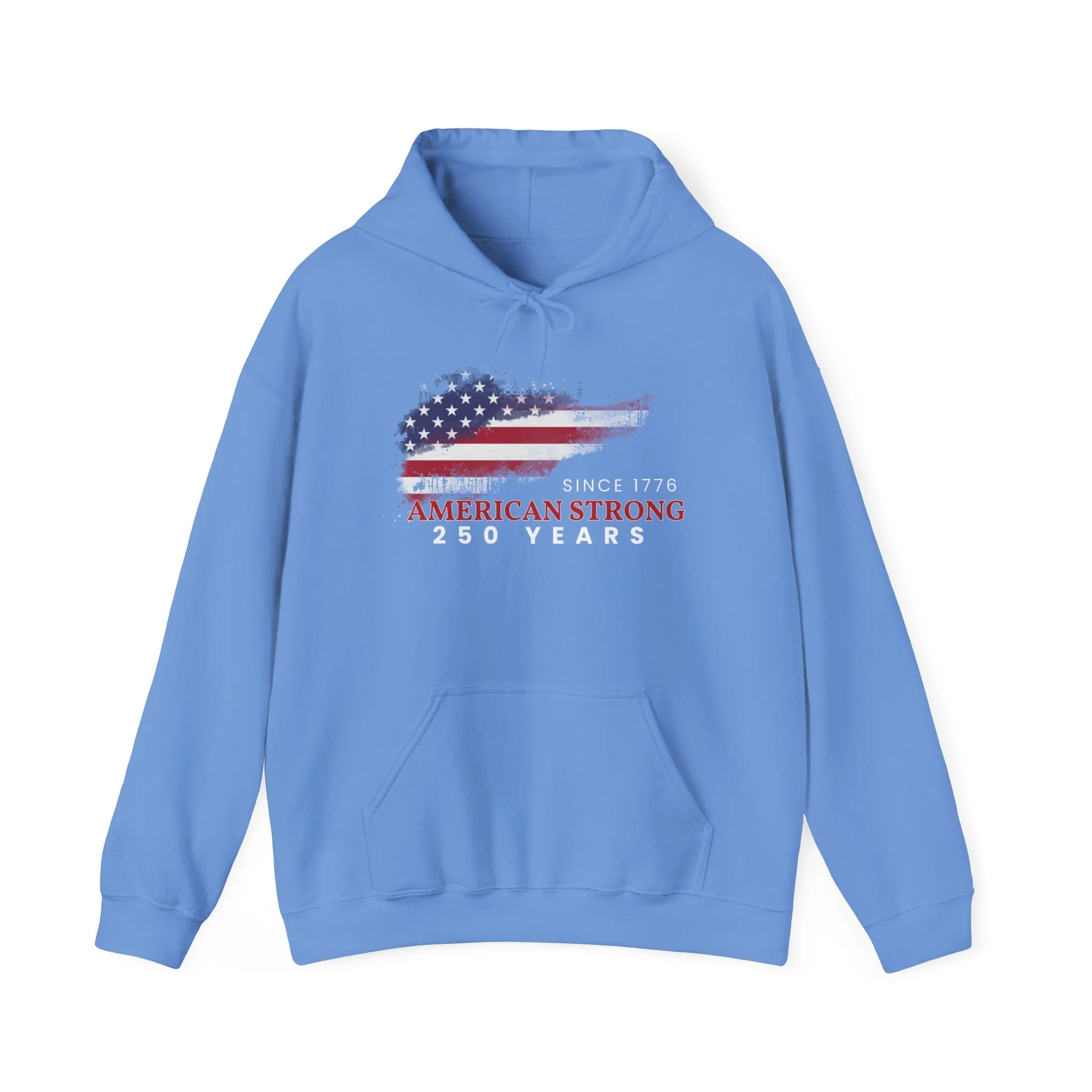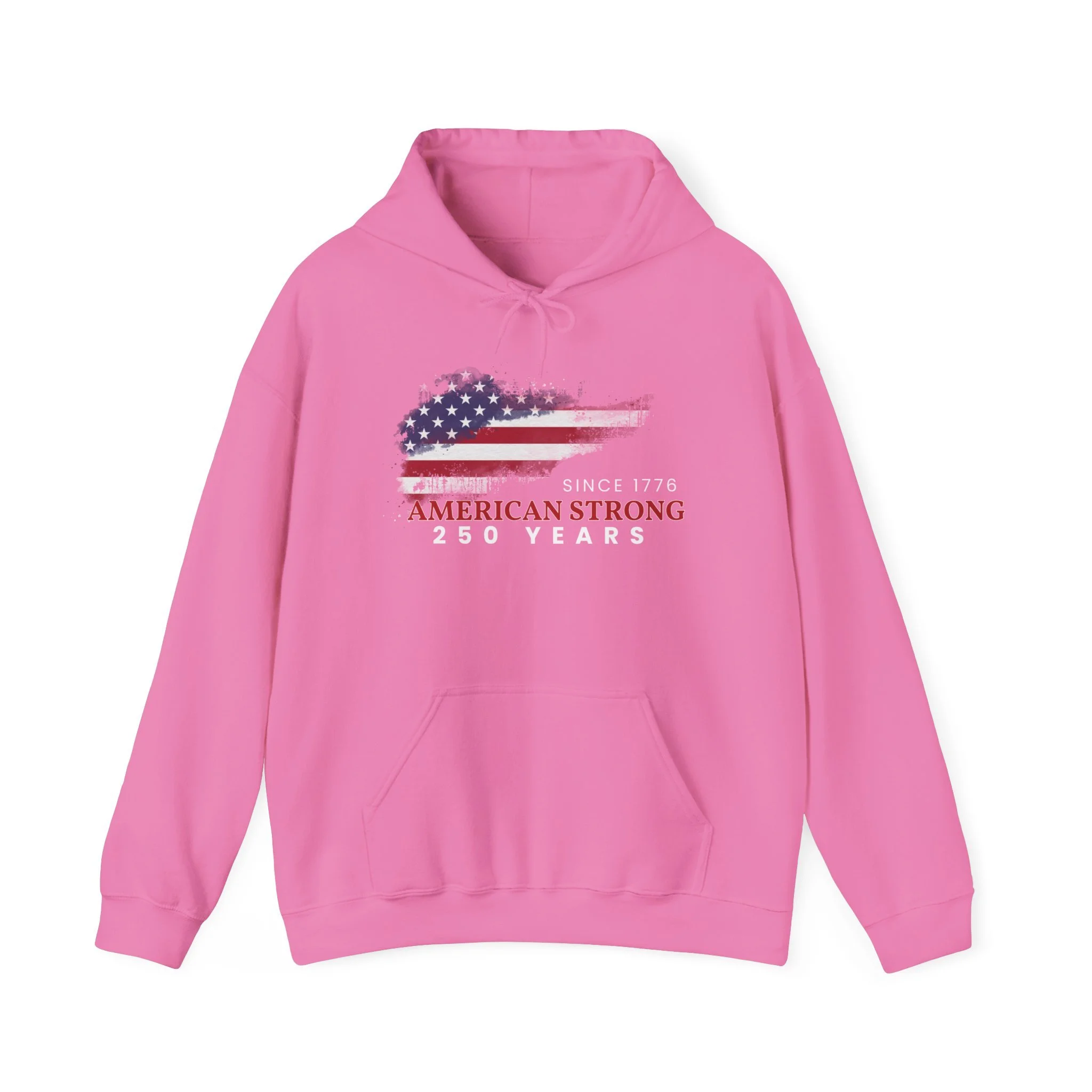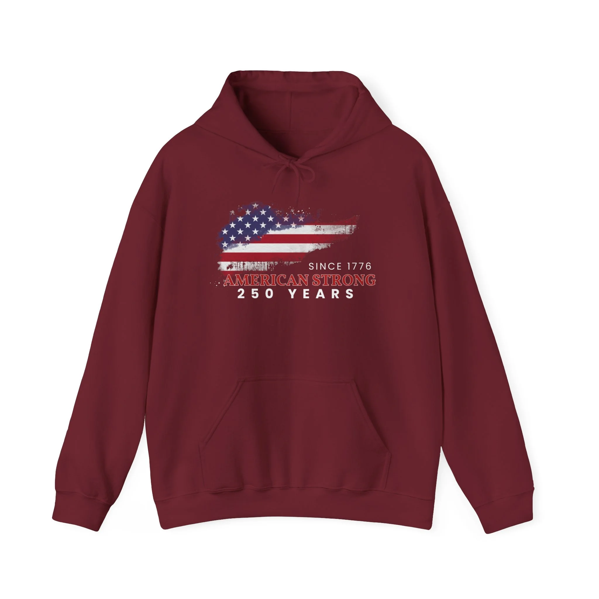 This mid-weight hoodie carries a quietly proud, made-for-the-long-haul vibe. The front graphic layers a distressed American flag over a rugged silhouette with the text “Since 1776” and “American Strong — 250 Years,” giving the piece a lived-in, heirloom feel. Slip it on when you want warmth without fuss — the double-lined hood and color-matched drawcord keep wind off your neck, while the roomy kangaroo pocket is ready for cold hands or a coffee. Built from a soft cotton/poly blend and knitted without side seams, it wears comfortably and holds prints and embroidery crisply. It settles easily into weekend routines, backyard barbecues, local parades, or quiet mornings on the porch — a straightforward, durable layer that nods to heritage without shouting.