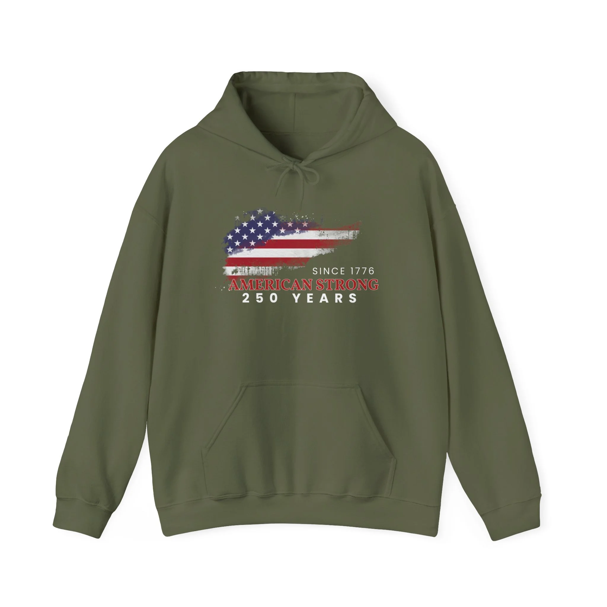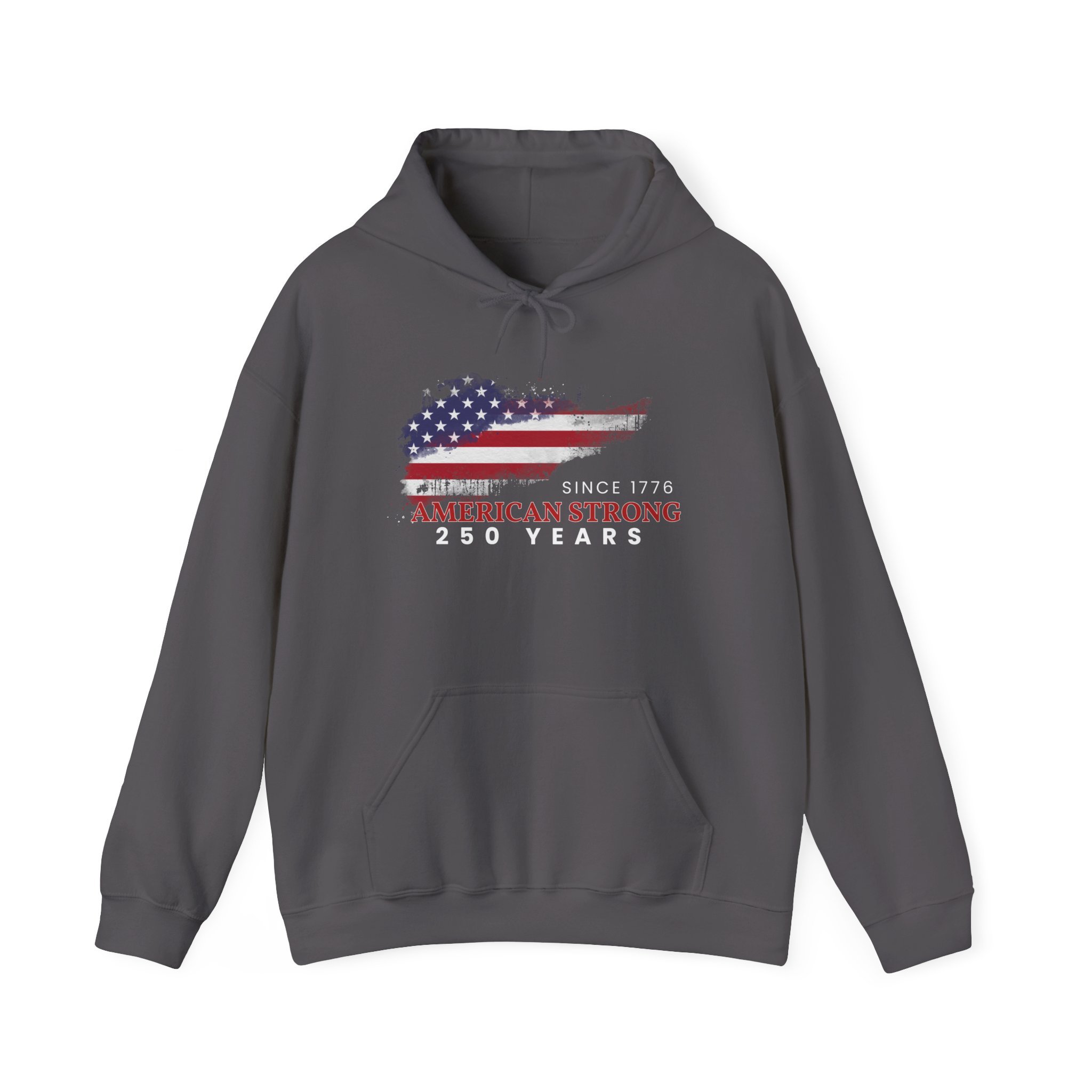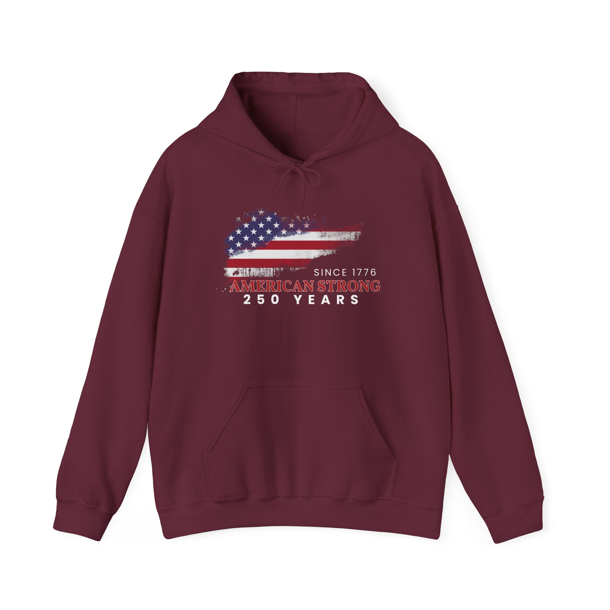 This mid-weight hoodie brings a quiet, lived-in confidence to every chilly morning and backyard gathering. The faded American-flag graphic and “Since 1776 — American Strong — 250 Years” text sit slightly weathered on the chest, evoking long drives down country roads, small-town parades, and backyard cookouts where stories are swapped over coffee and coals. The roomy kangaroo pocket and double-lined hood are built for comfort — slip your hands in, pull the hood up against a brisk wind, and feel like you’re wrapped in something familiar and steady. It pairs naturally with worn jeans or layered under a work jacket, made to be reached for again and again when you want a dependable, quietly patriotic layer.