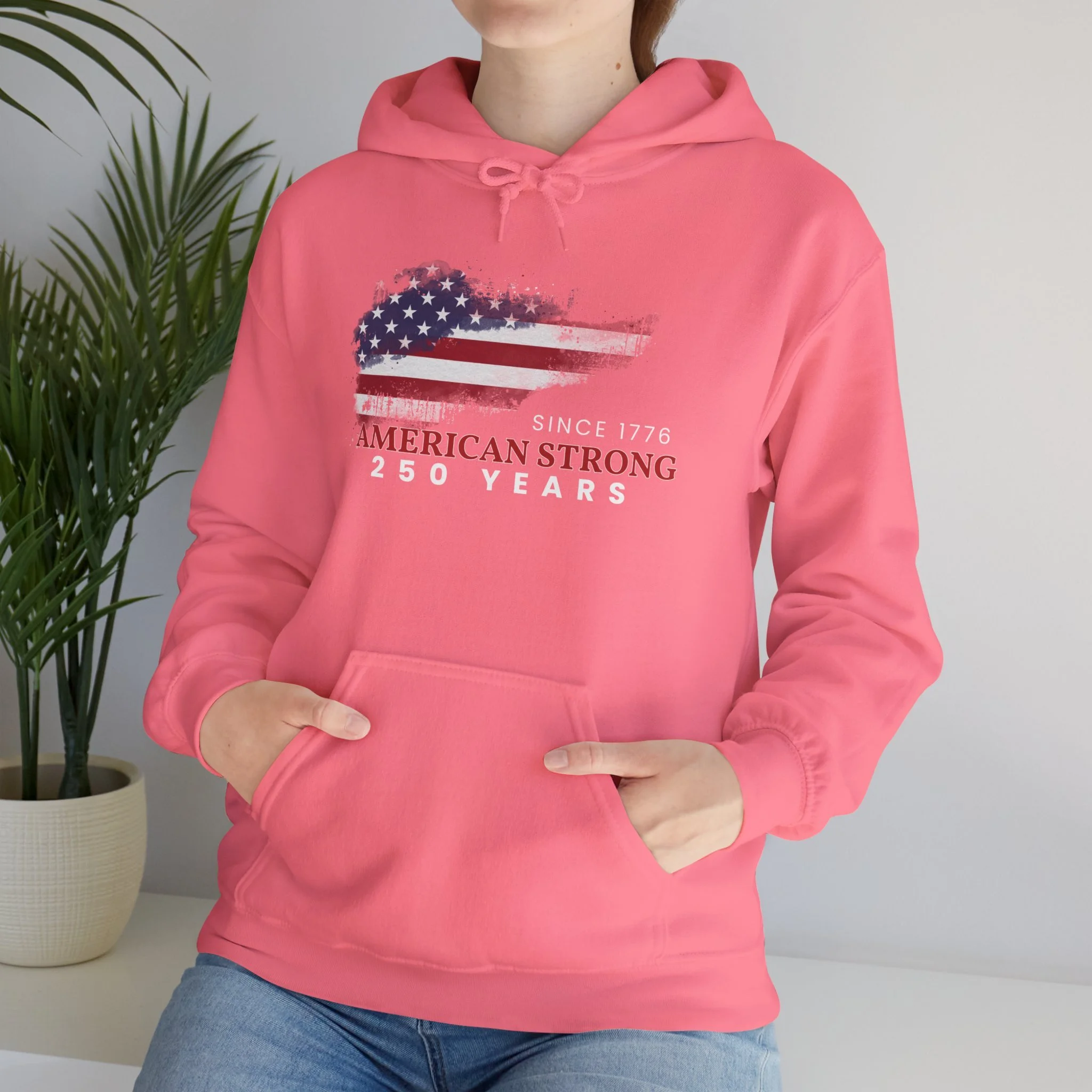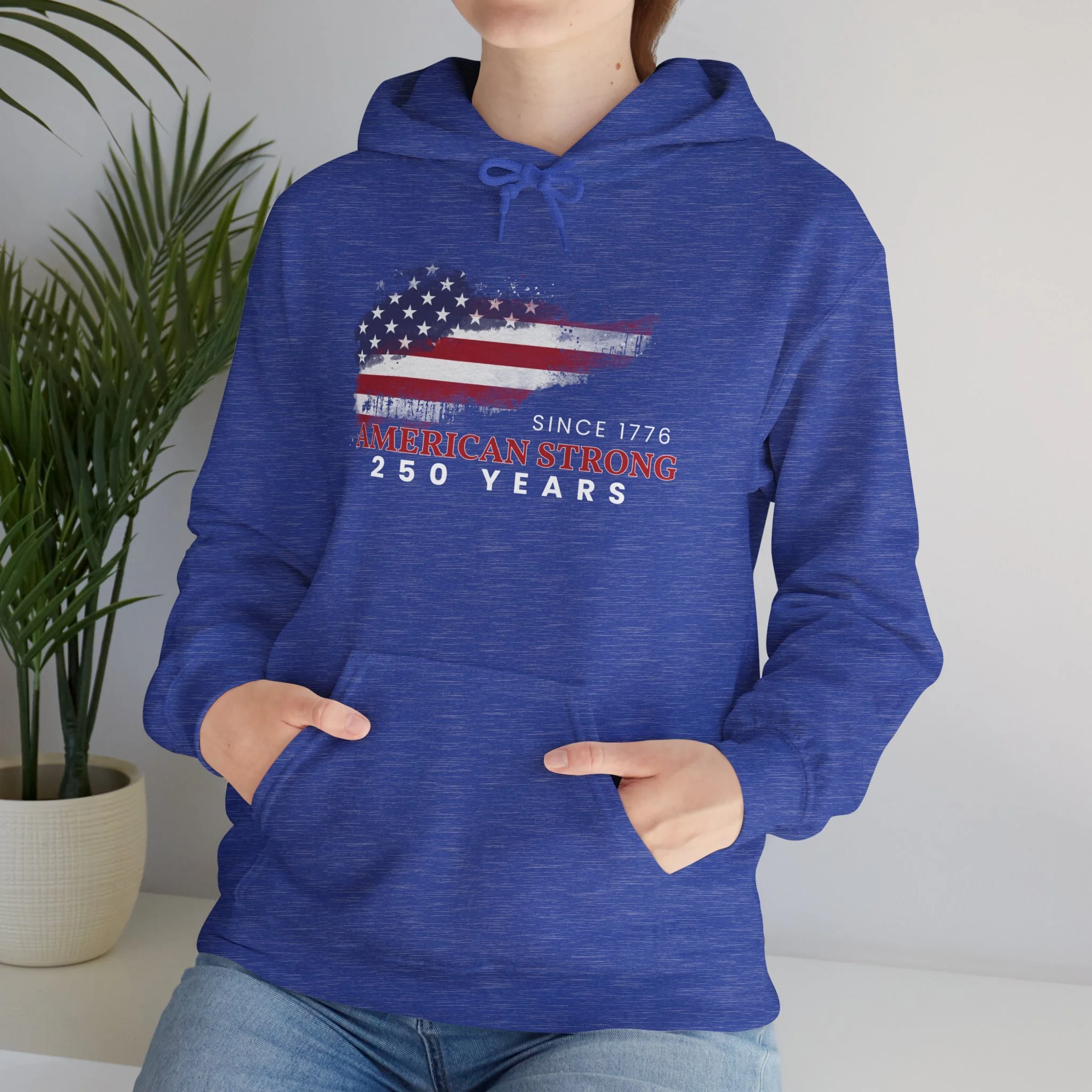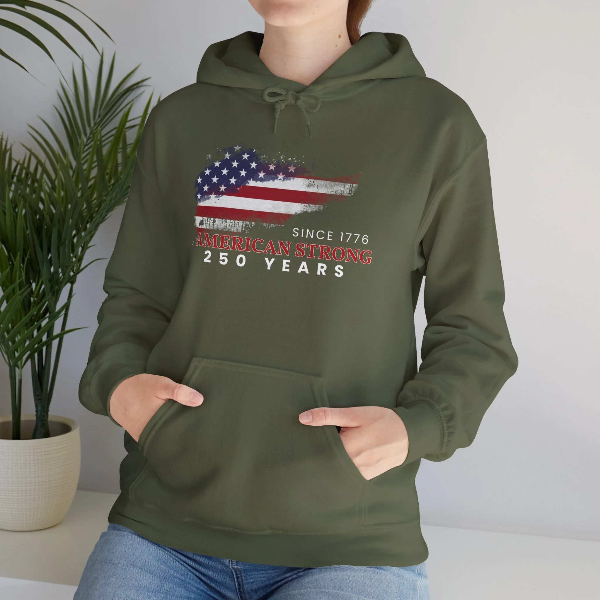 This mid-weight hoodie brings a quiet, lived-in confidence to every chilly morning and backyard gathering. The faded American-flag graphic and “Since 1776 — American Strong — 250 Years” text sit slightly weathered on the chest, evoking long drives down country roads, small-town parades, and backyard cookouts where stories are swapped over coffee and coals. The roomy kangaroo pocket and double-lined hood are built for comfort — slip your hands in, pull the hood up against a brisk wind, and feel like you’re wrapped in something familiar and steady. It pairs naturally with worn jeans or layered under a work jacket, made to be reached for again and again when you want a dependable, quietly patriotic layer.