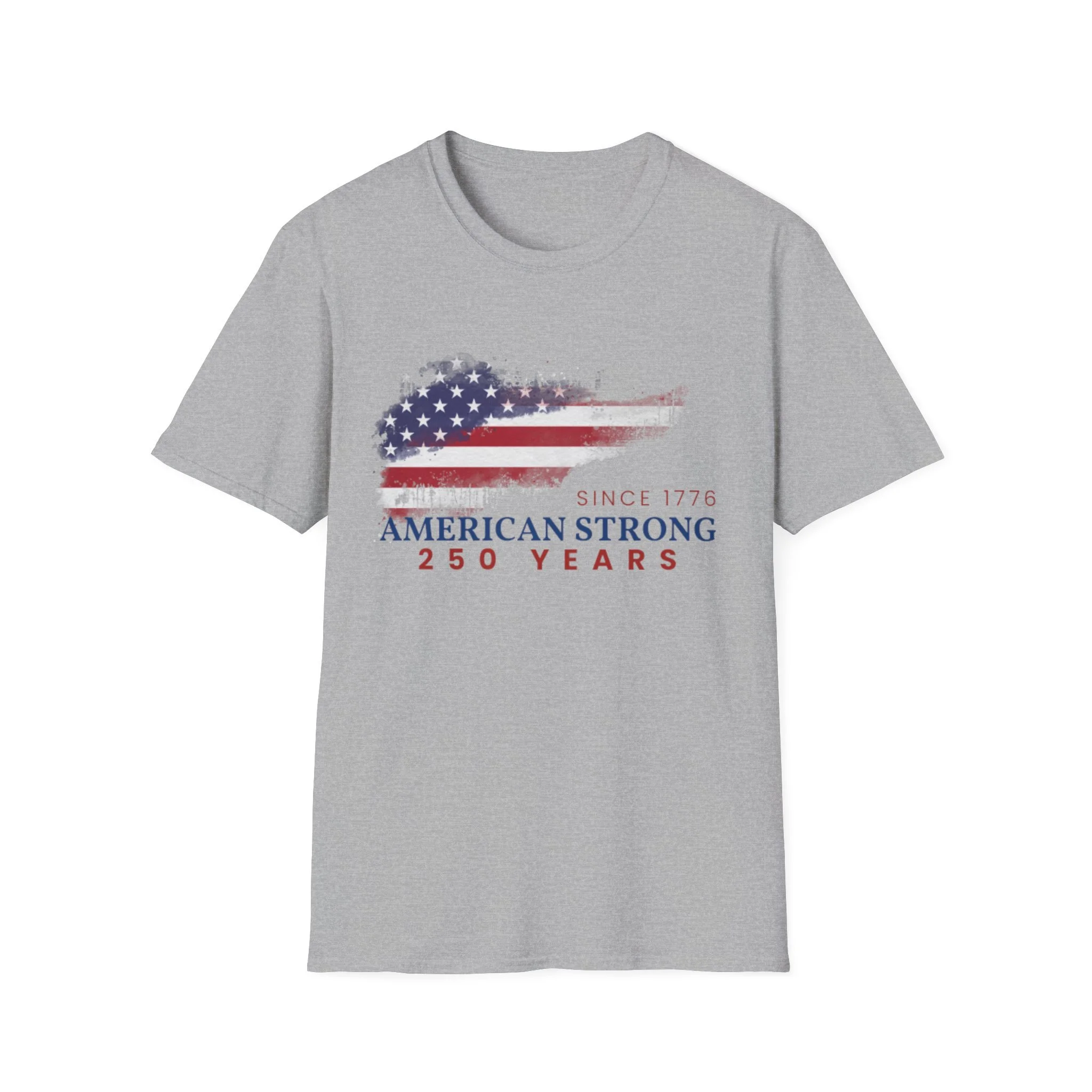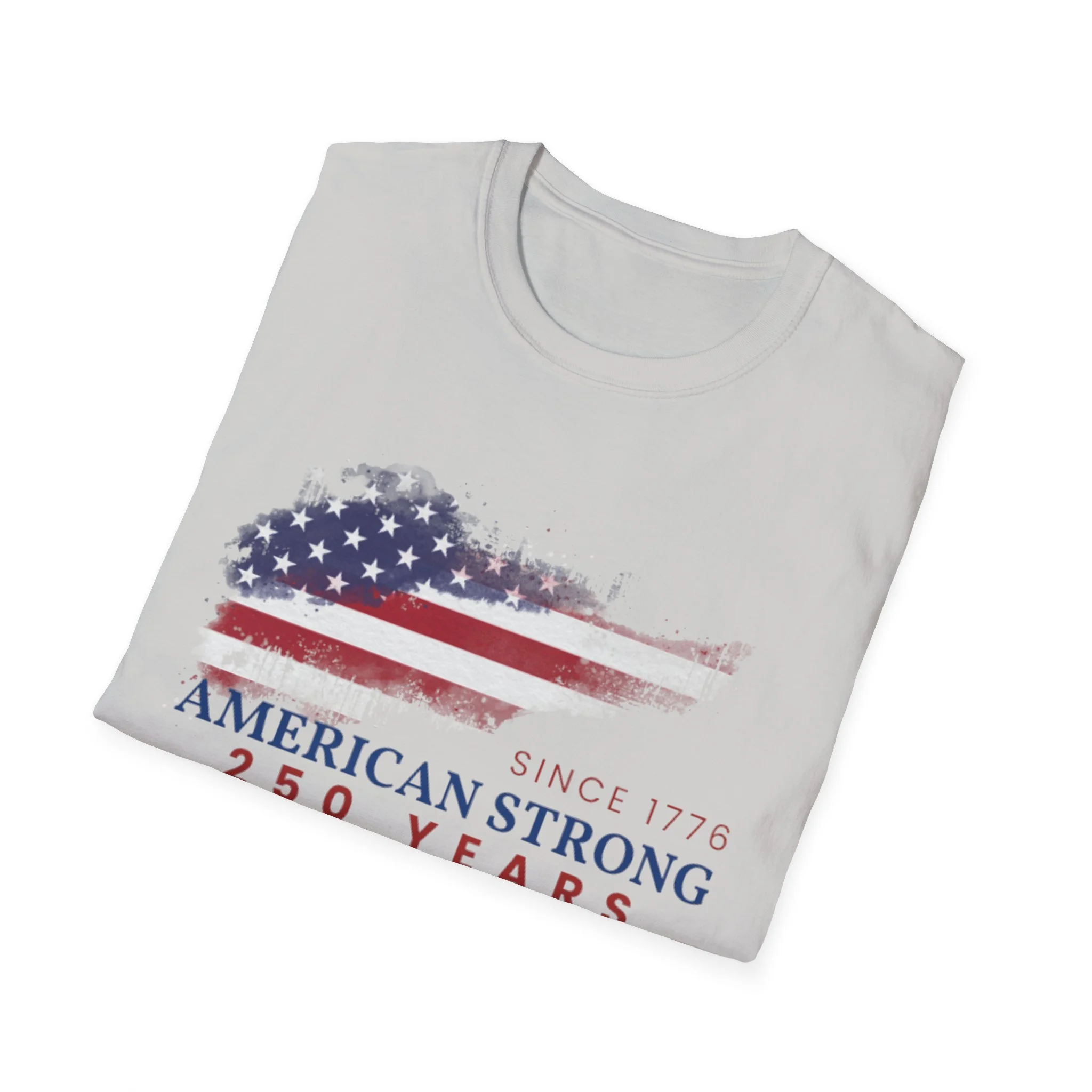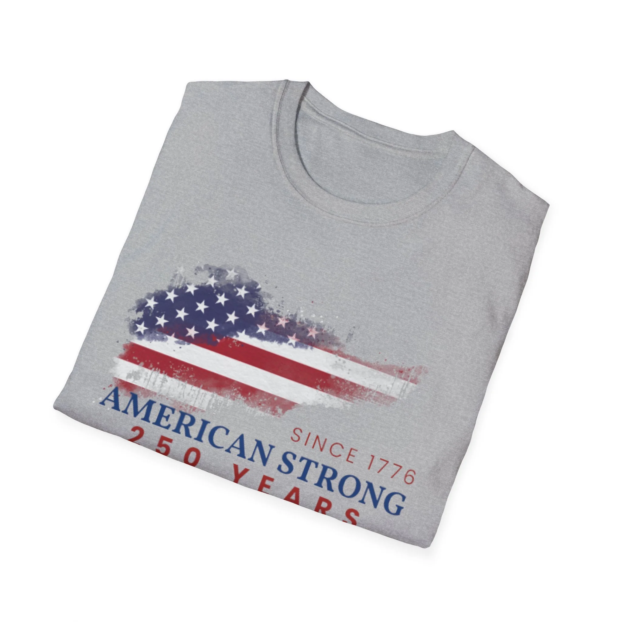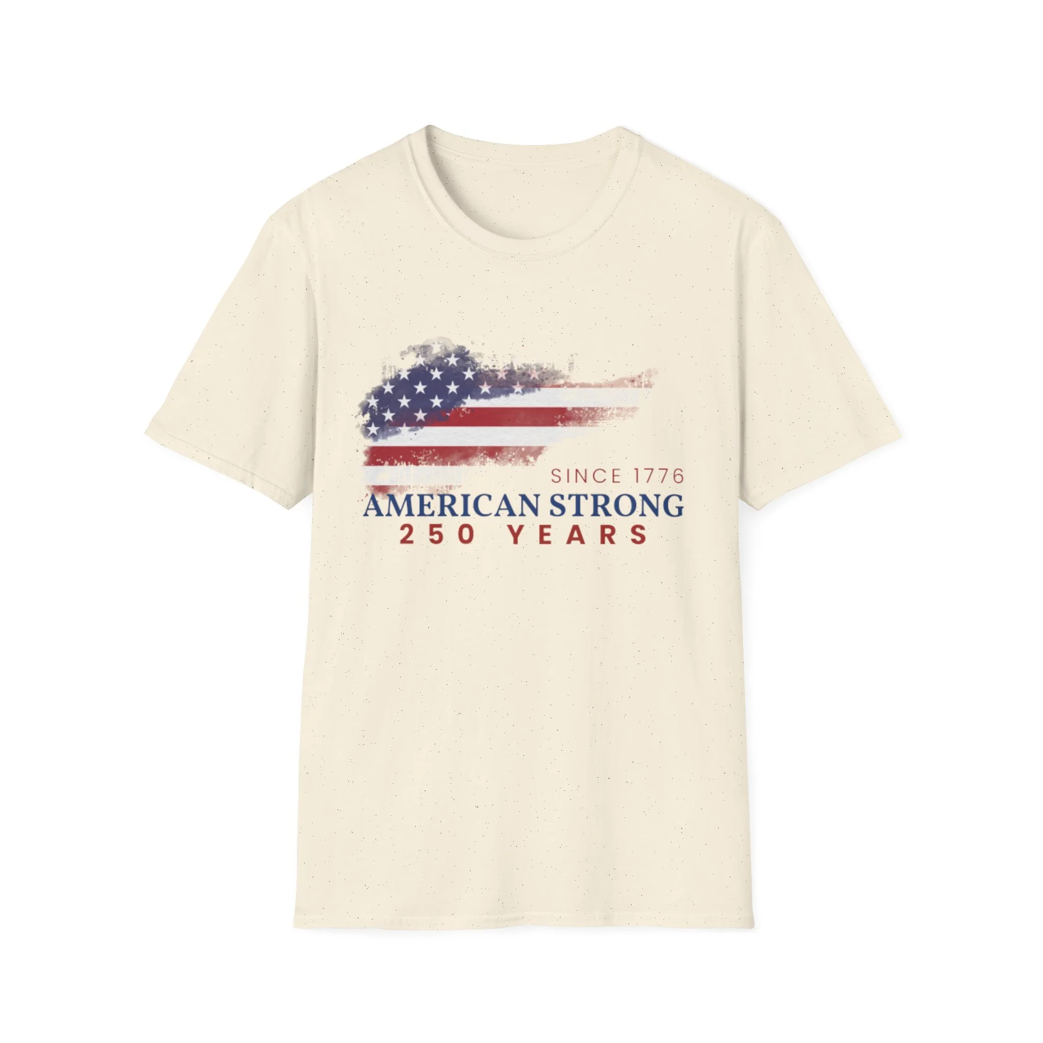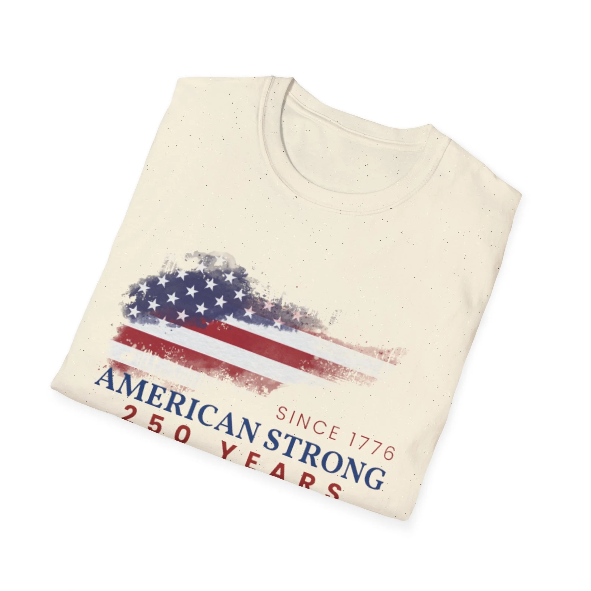 A clean, comfortably worn-in tee that carries a quiet pride. The lightweight ring-spun cotton feels soft against the skin while the distressed American flag graphic and subtle “American Strong — 250 Years” text sit low and honest on the chest. It layers easily under a flannel or wears alone at backyard barbecues, parades, or casual meetups. Breathable and durable, this shirt moves with you and keeps its shape thanks to ribbed collar and reinforced shoulder tape. Every detail — from the tear-away label to the tubular knit — keeps comfort in focus so the message remains the star.