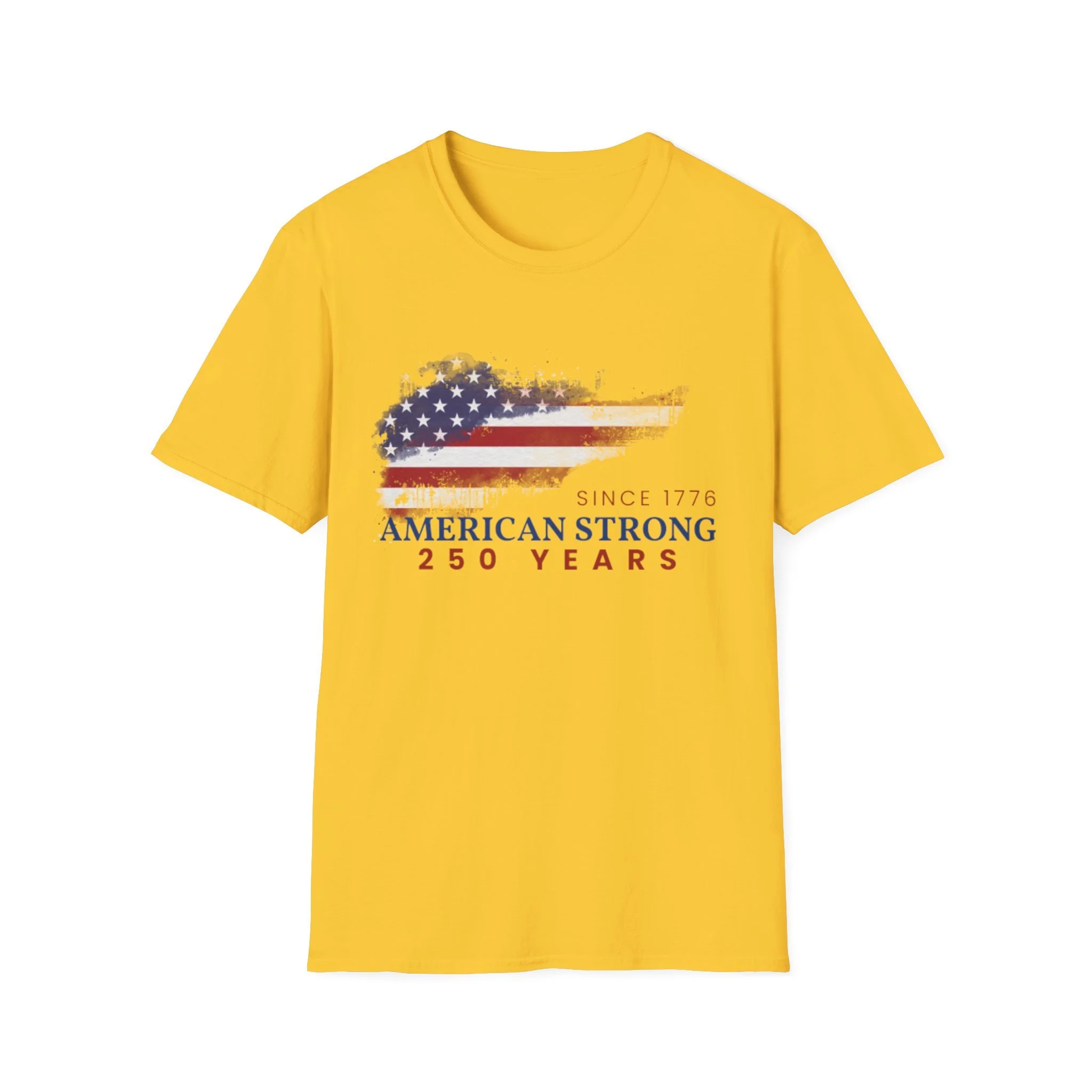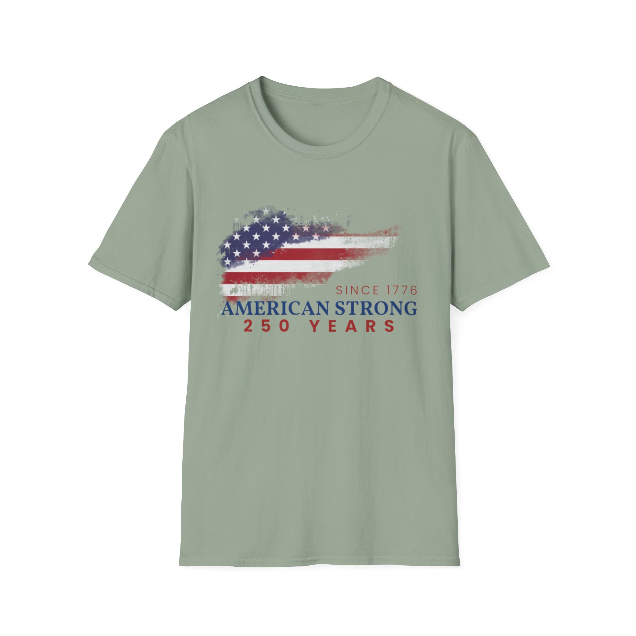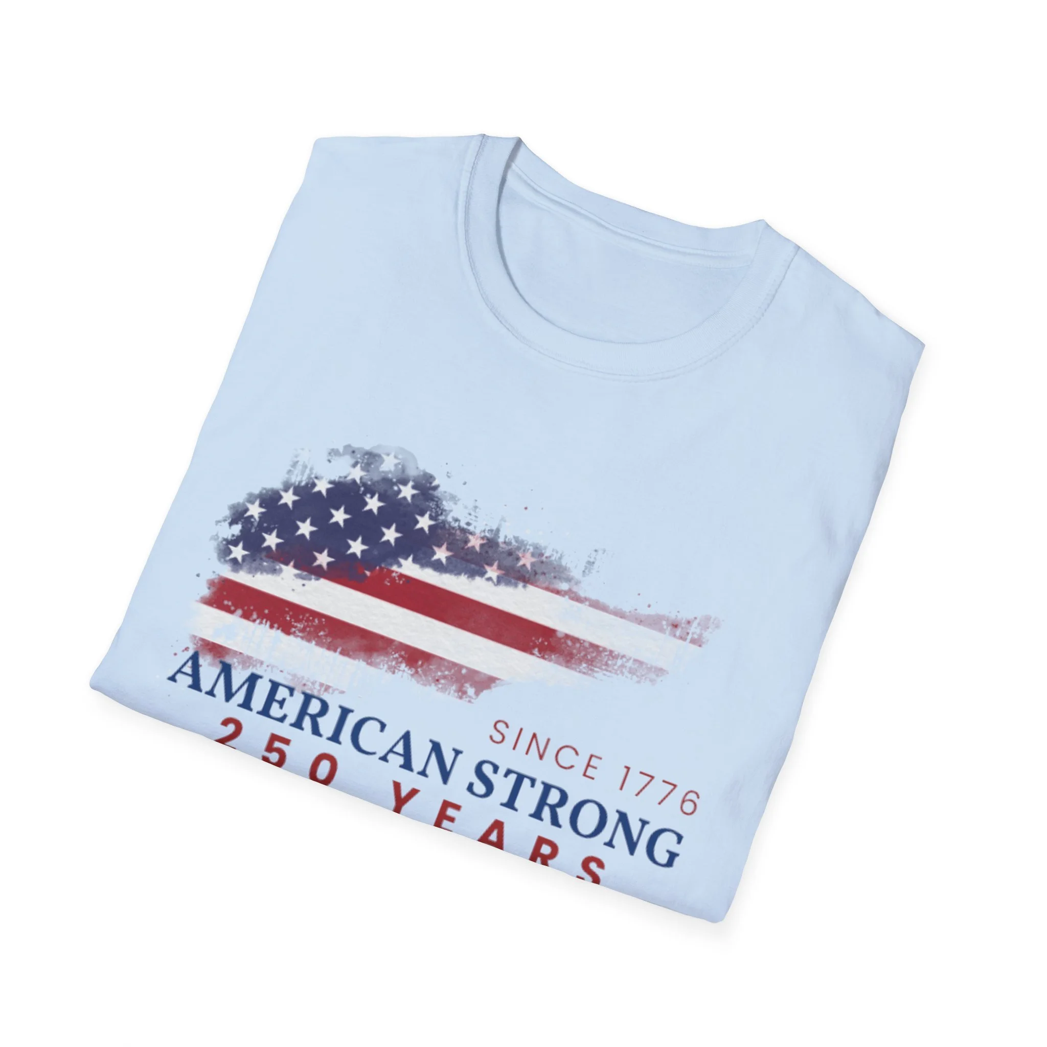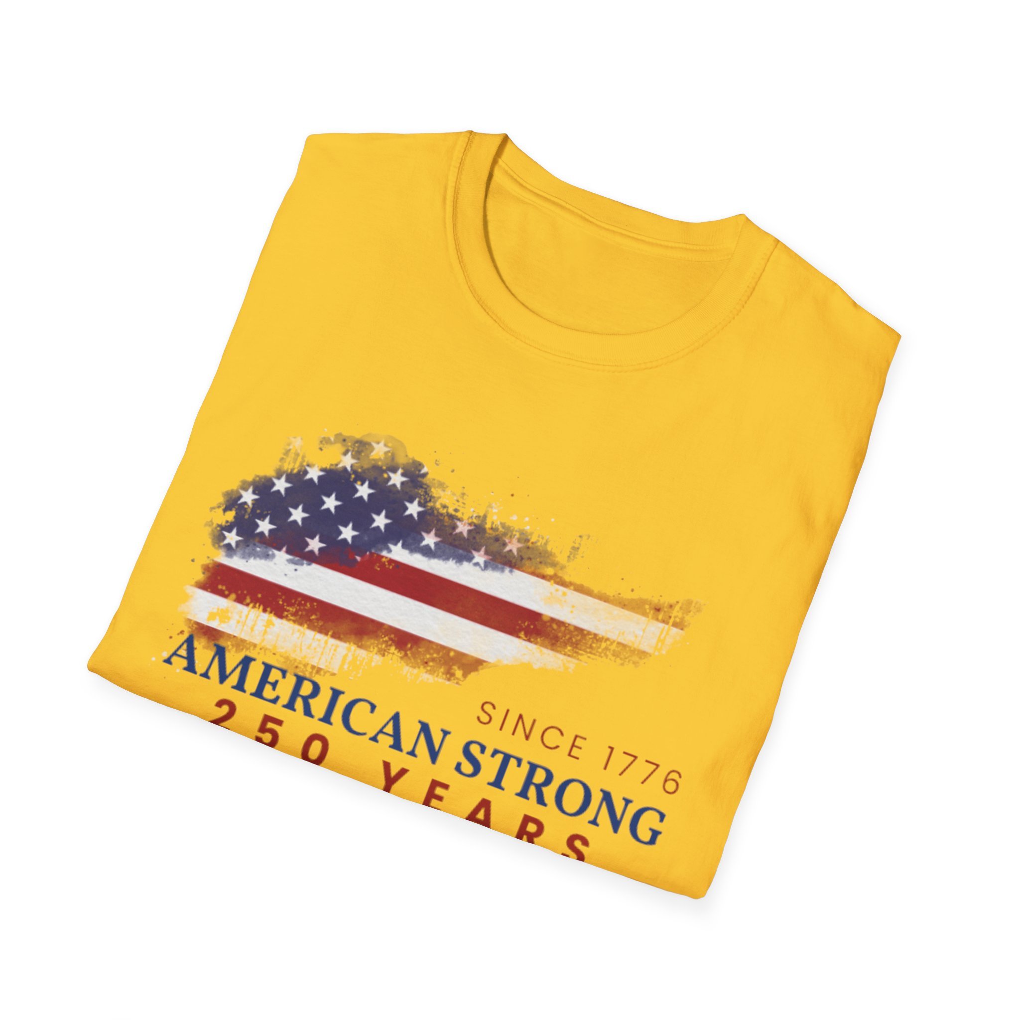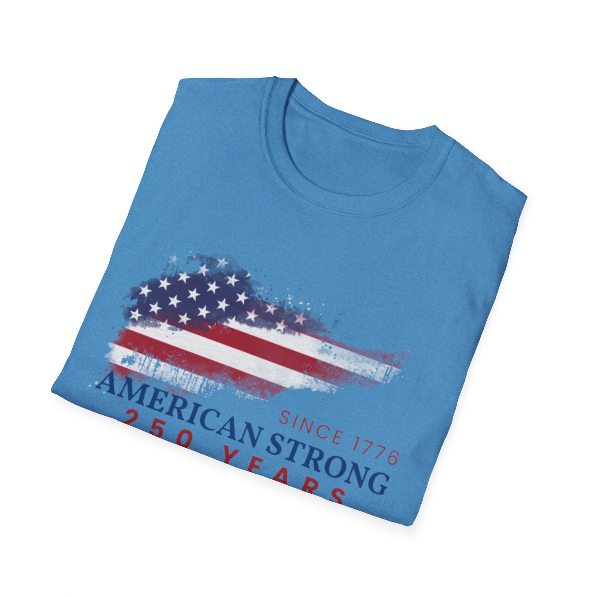 A clean, comfortably worn-in tee that carries a quiet pride. The lightweight ring-spun cotton feels soft against the skin while the distressed American flag graphic and subtle “American Strong — 250 Years” text sit low and honest on the chest. It layers easily under a flannel or wears alone at backyard barbecues, parades, or casual meetups. Breathable and durable, this shirt moves with you and keeps its shape thanks to ribbed collar and reinforced shoulder tape. Every detail — from the tear-away label to the tubular knit — keeps comfort in focus so the message remains the star.