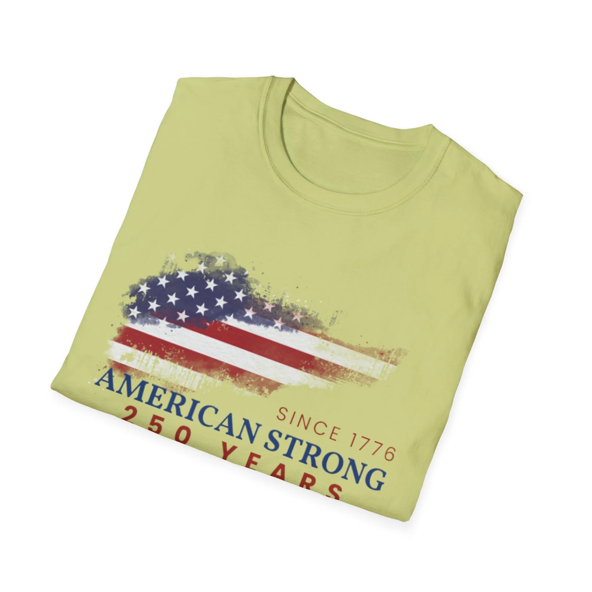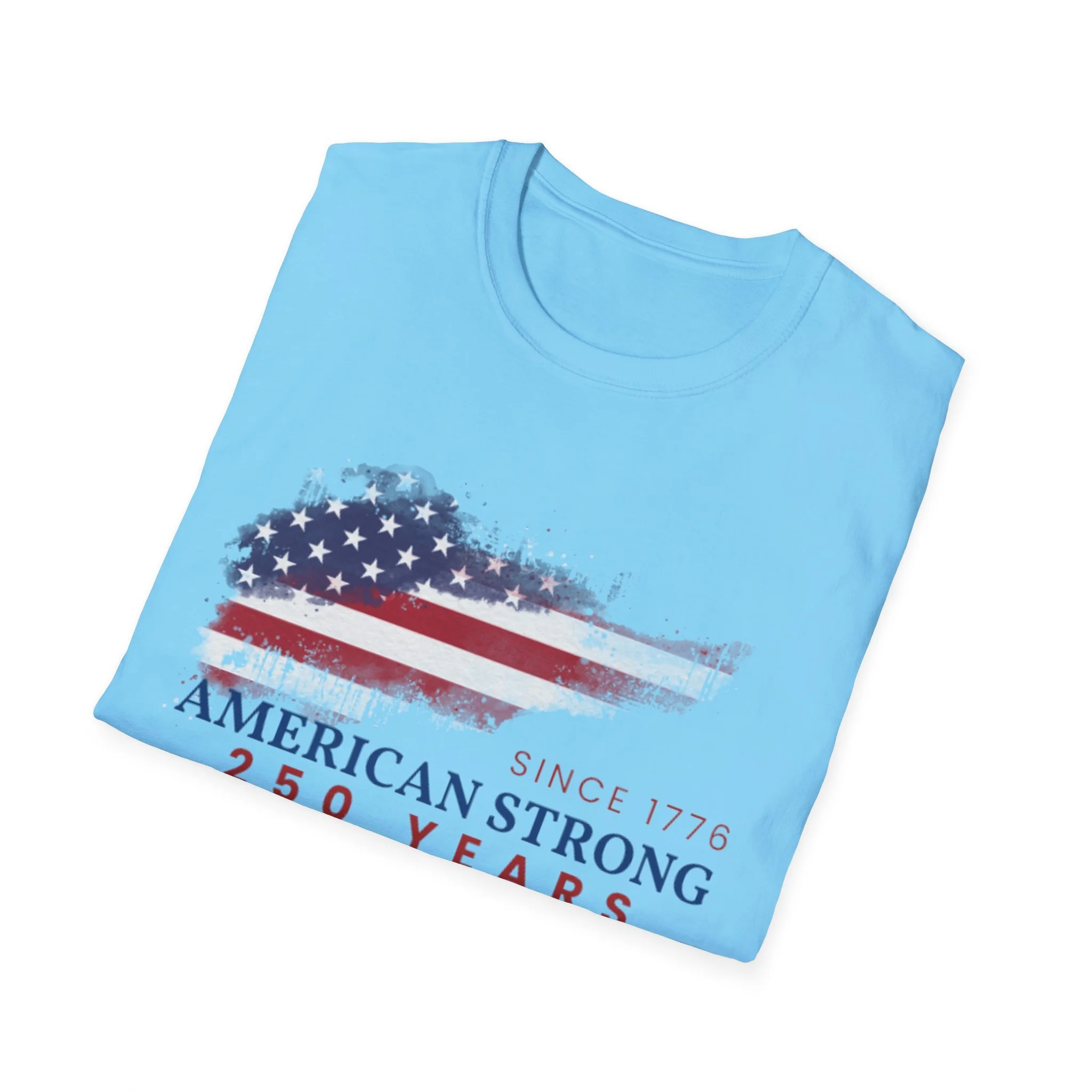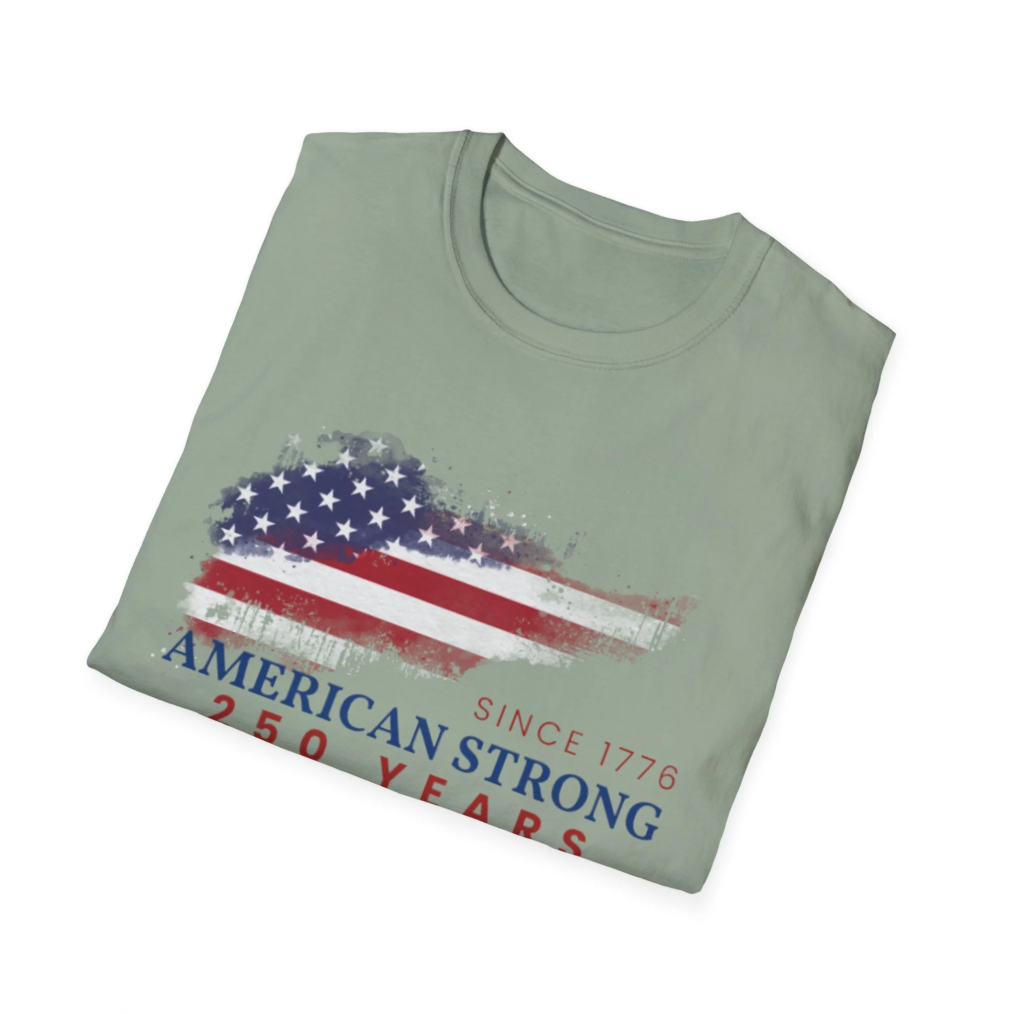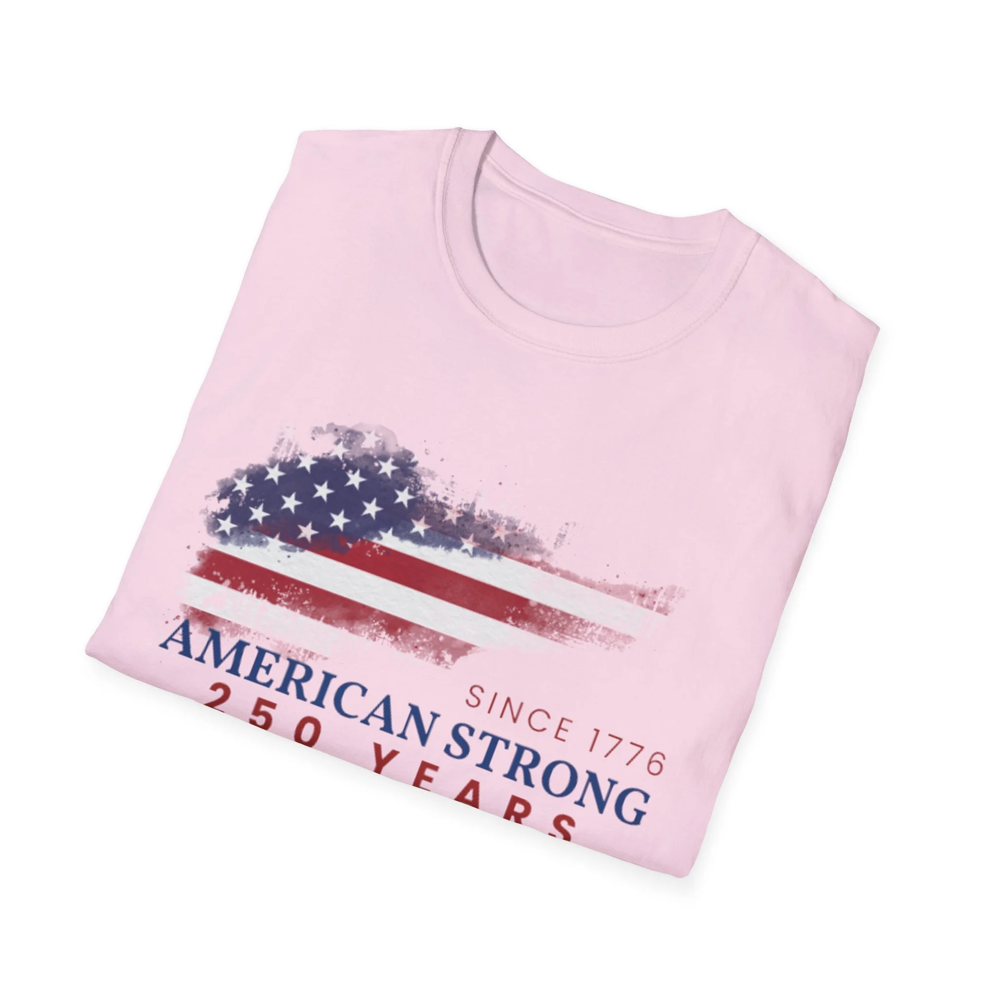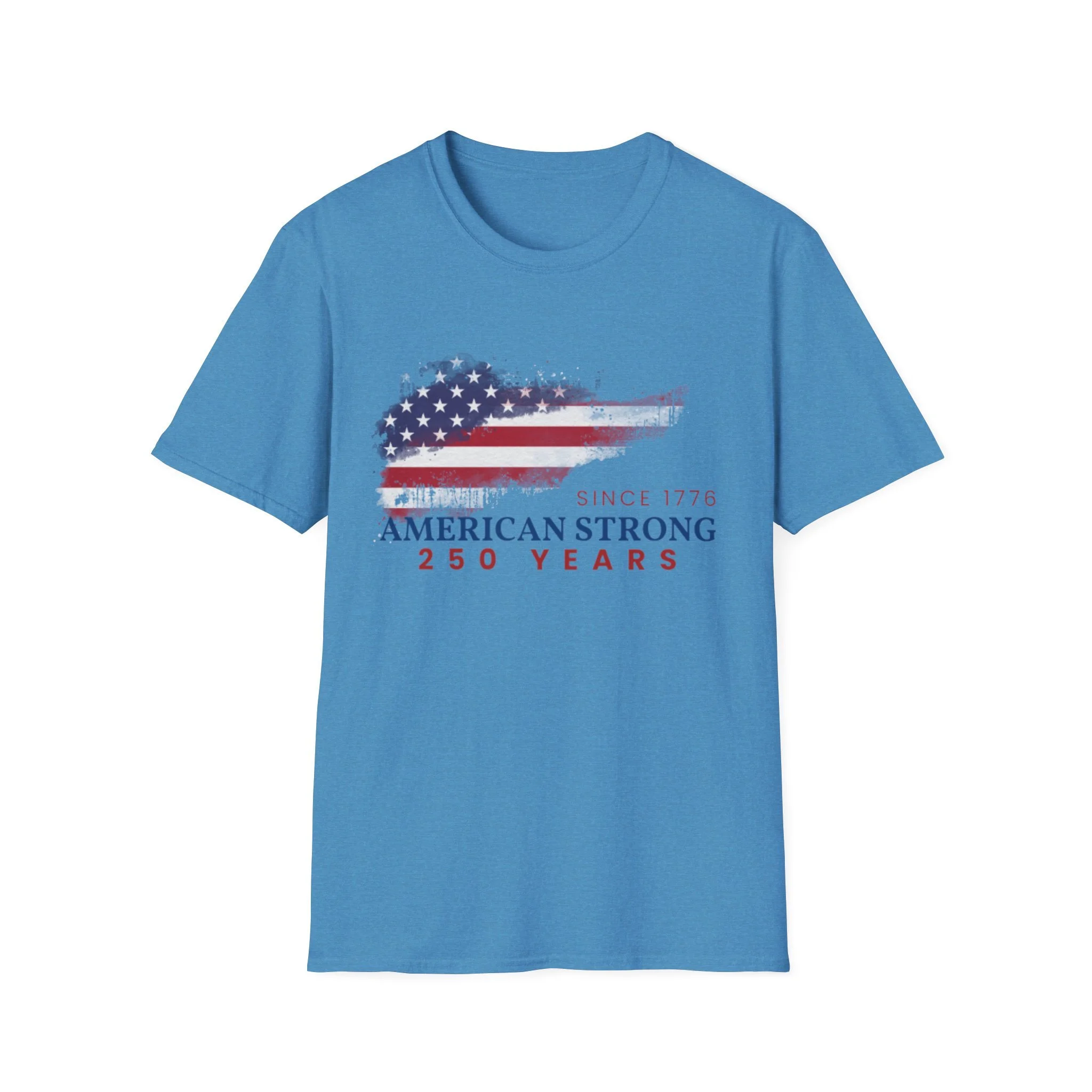 A clean, comfortably worn-in tee that carries a quiet pride. The lightweight ring-spun cotton feels soft against the skin while the distressed American flag graphic and subtle “American Strong — 250 Years” text sit low and honest on the chest. It layers easily under a flannel or wears alone at backyard barbecues, parades, or casual meetups. Breathable and durable, this shirt moves with you and keeps its shape thanks to ribbed collar and reinforced shoulder tape. Every detail — from the tear-away label to the tubular knit — keeps comfort in focus so the message remains the star.