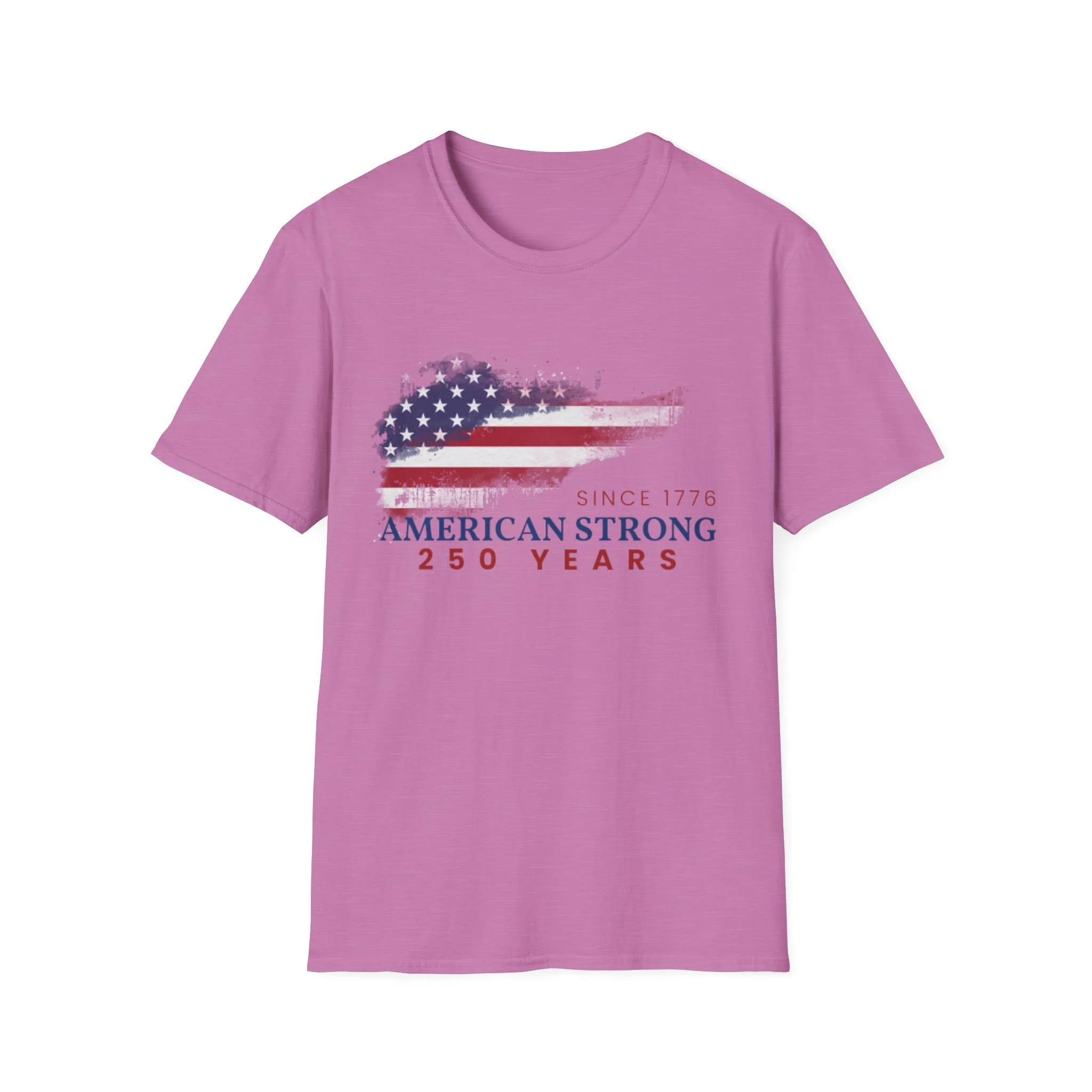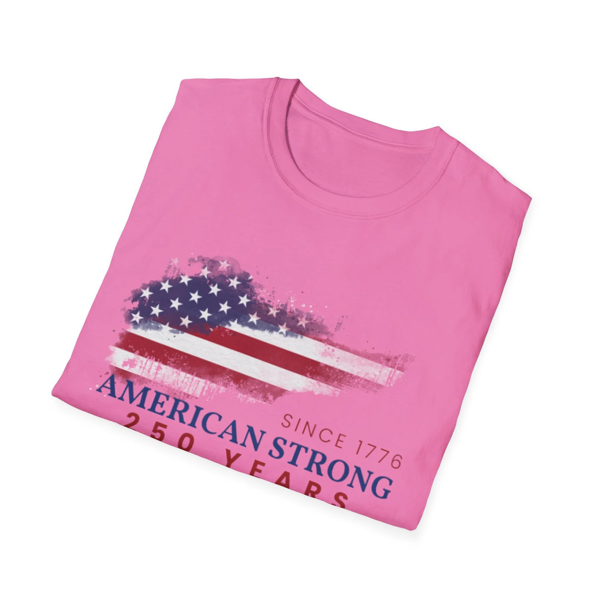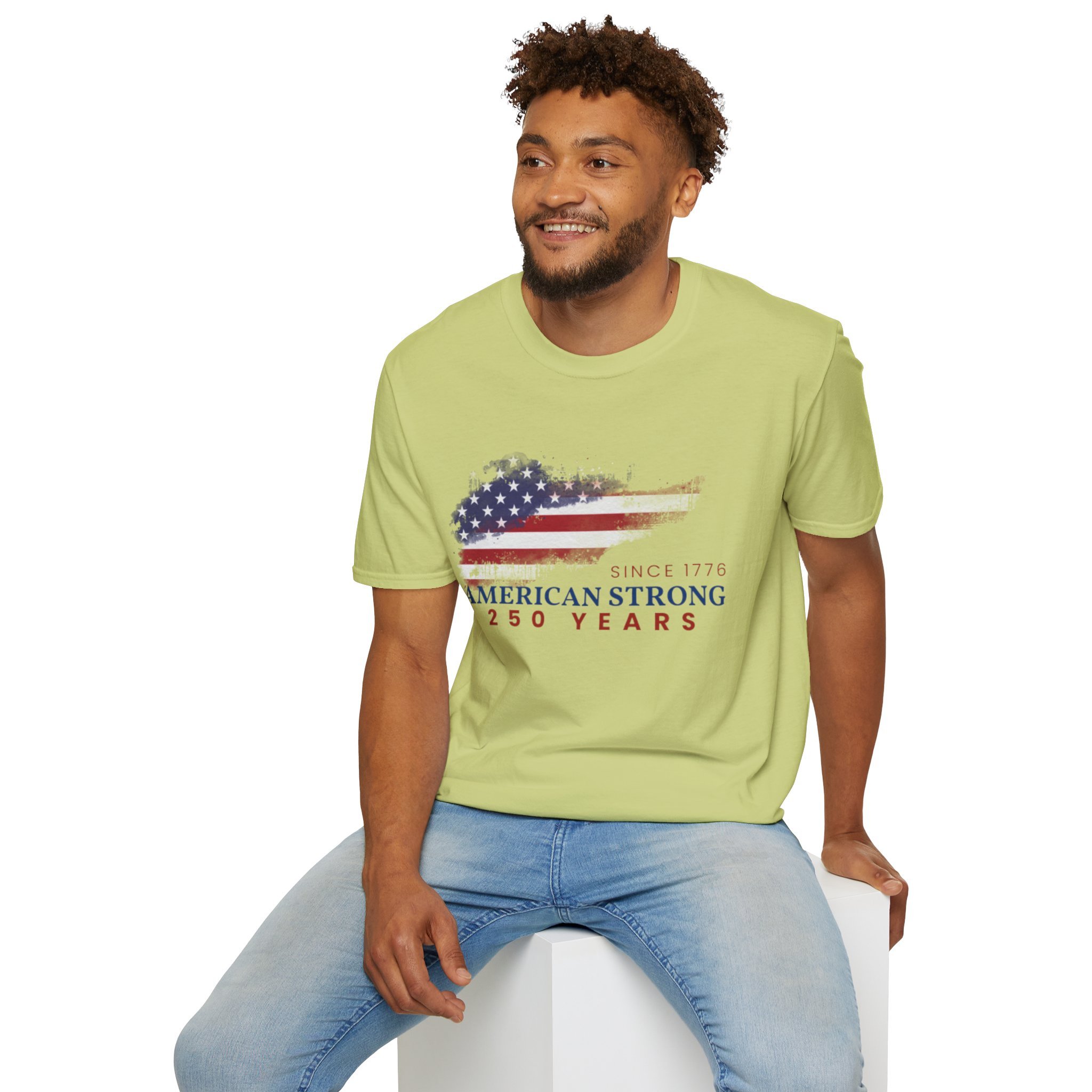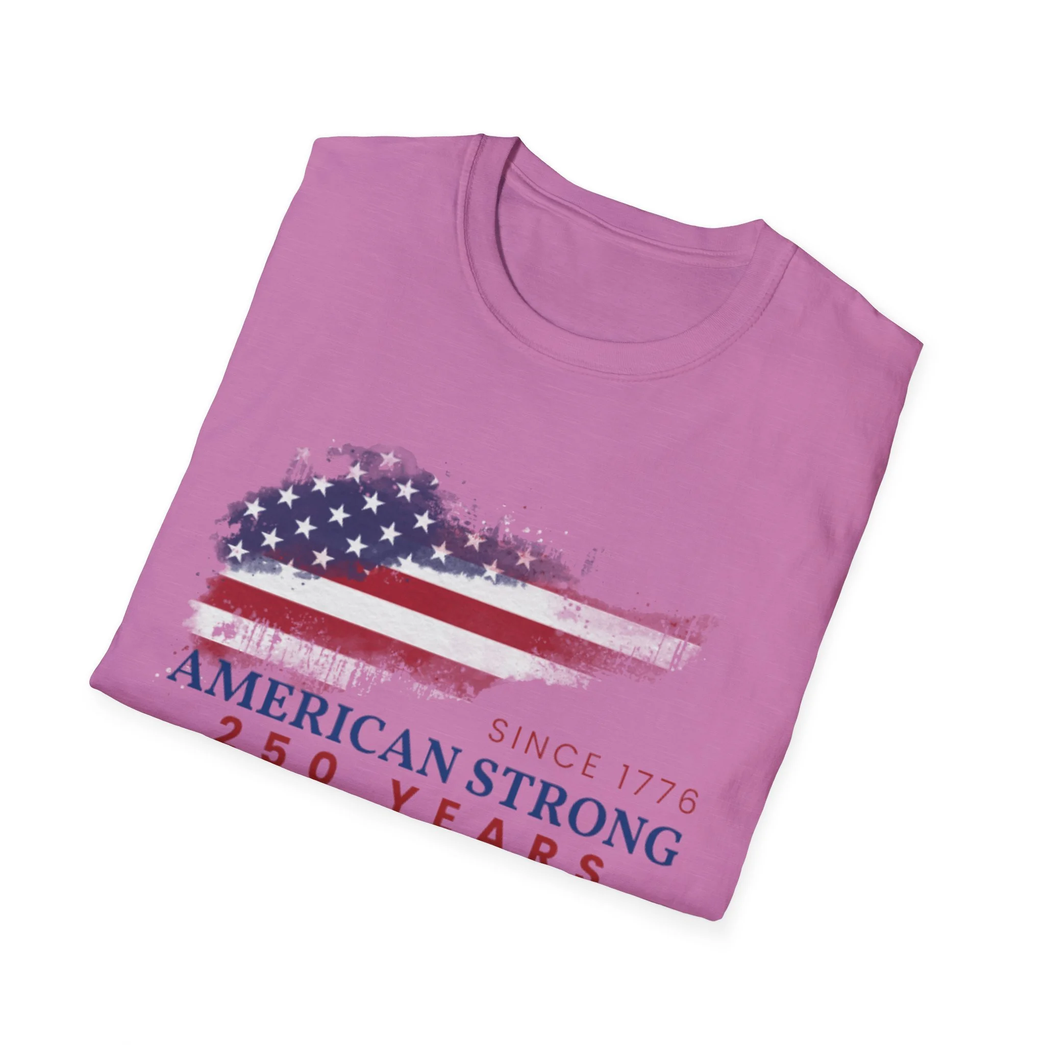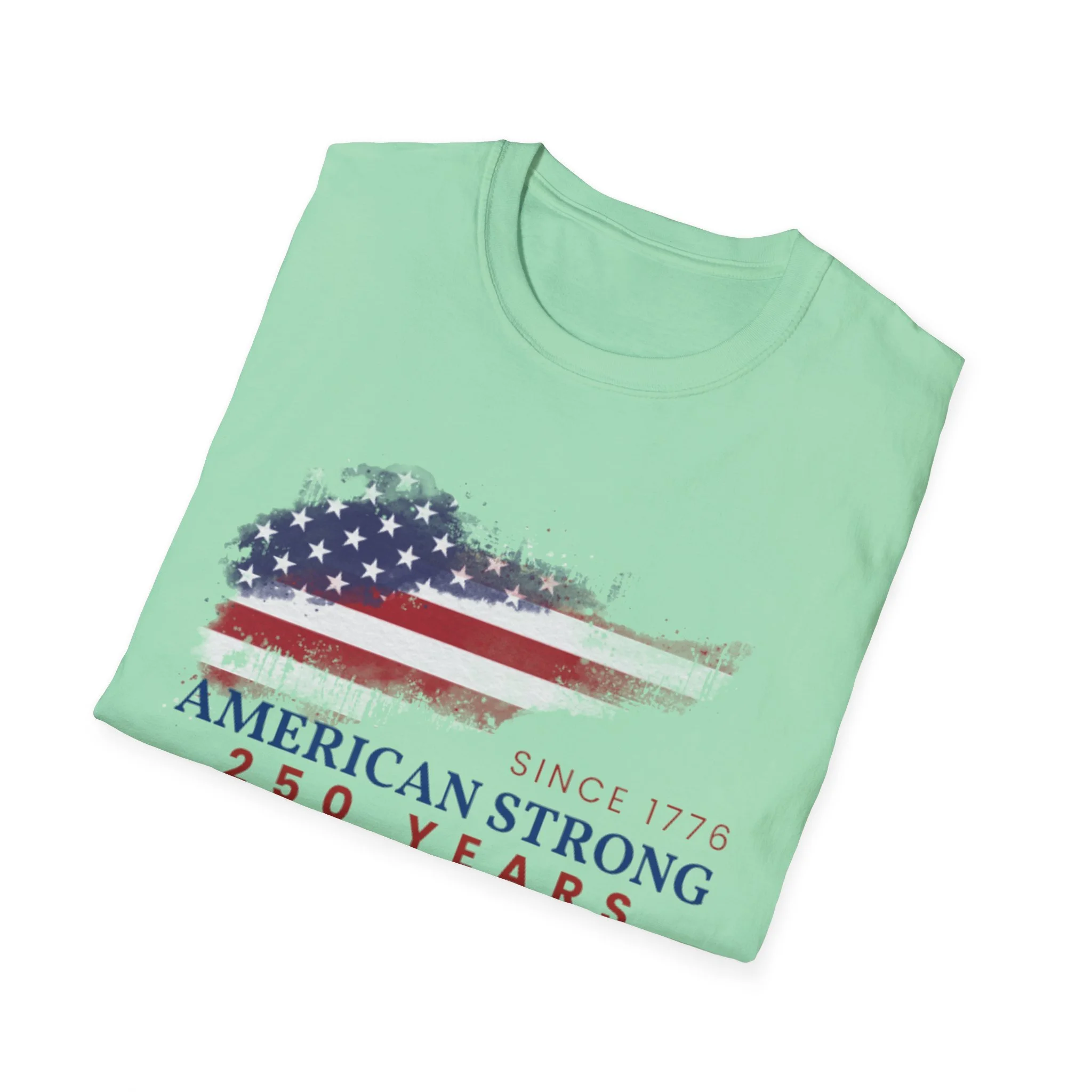 A clean, comfortably worn-in tee that carries a quiet pride. The lightweight ring-spun cotton feels soft against the skin while the distressed American flag graphic and subtle “American Strong — 250 Years” text sit low and honest on the chest. It layers easily under a flannel or wears alone at backyard barbecues, parades, or casual meetups. Breathable and durable, this shirt moves with you and keeps its shape thanks to ribbed collar and reinforced shoulder tape. Every detail — from the tear-away label to the tubular knit — keeps comfort in focus so the message remains the star.