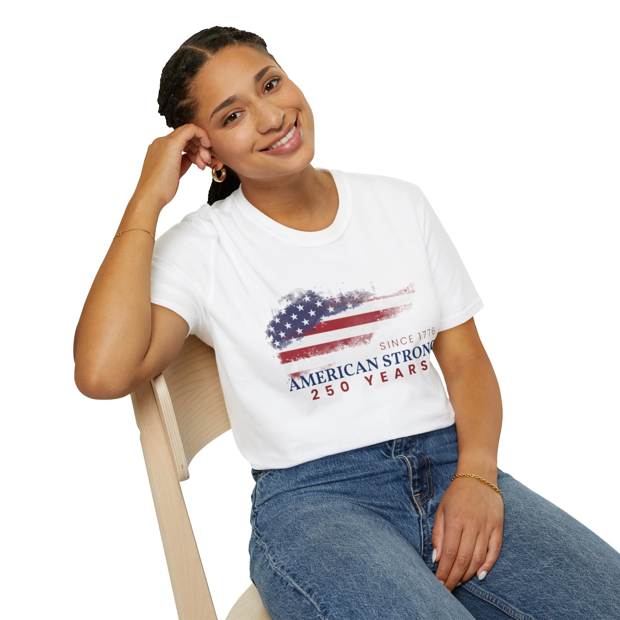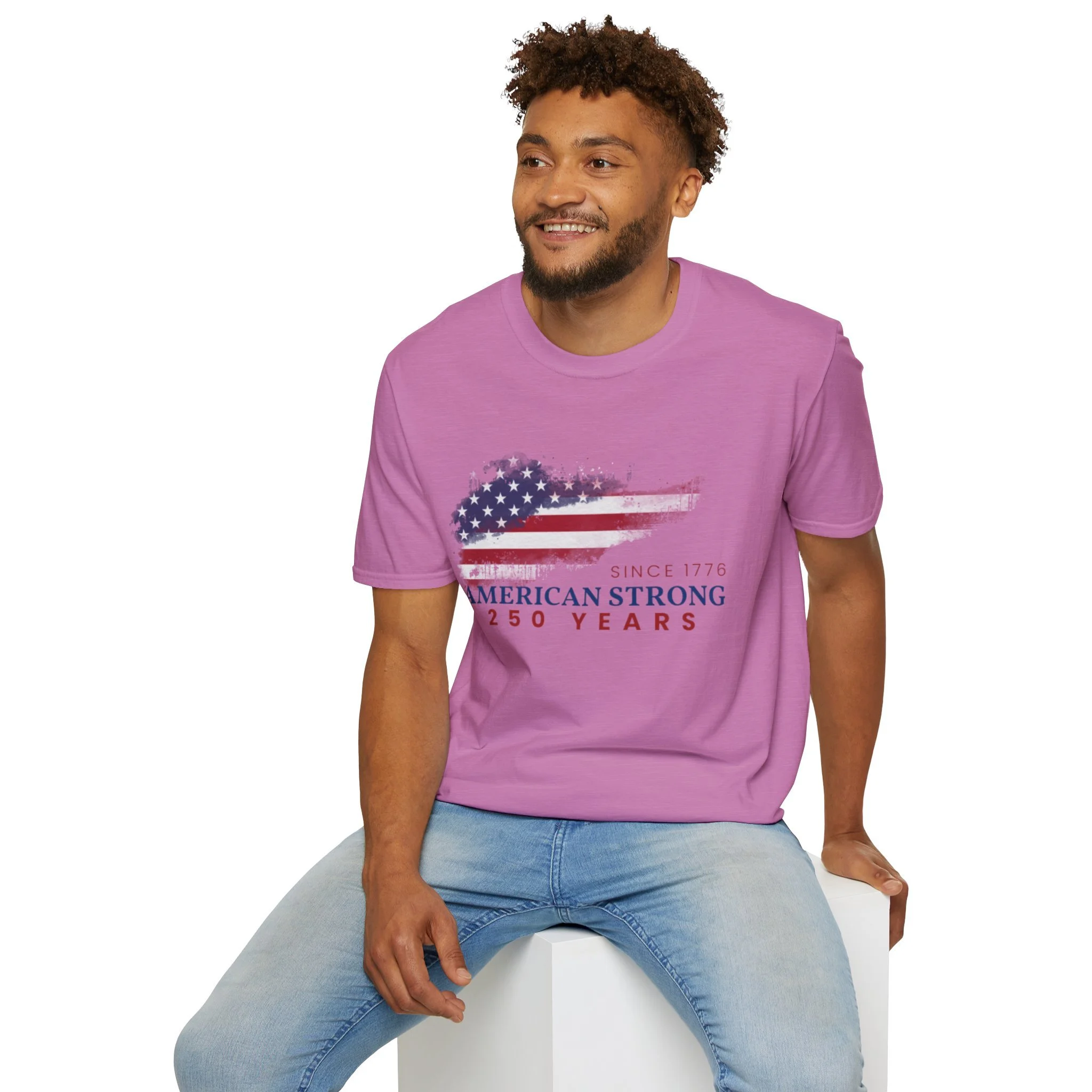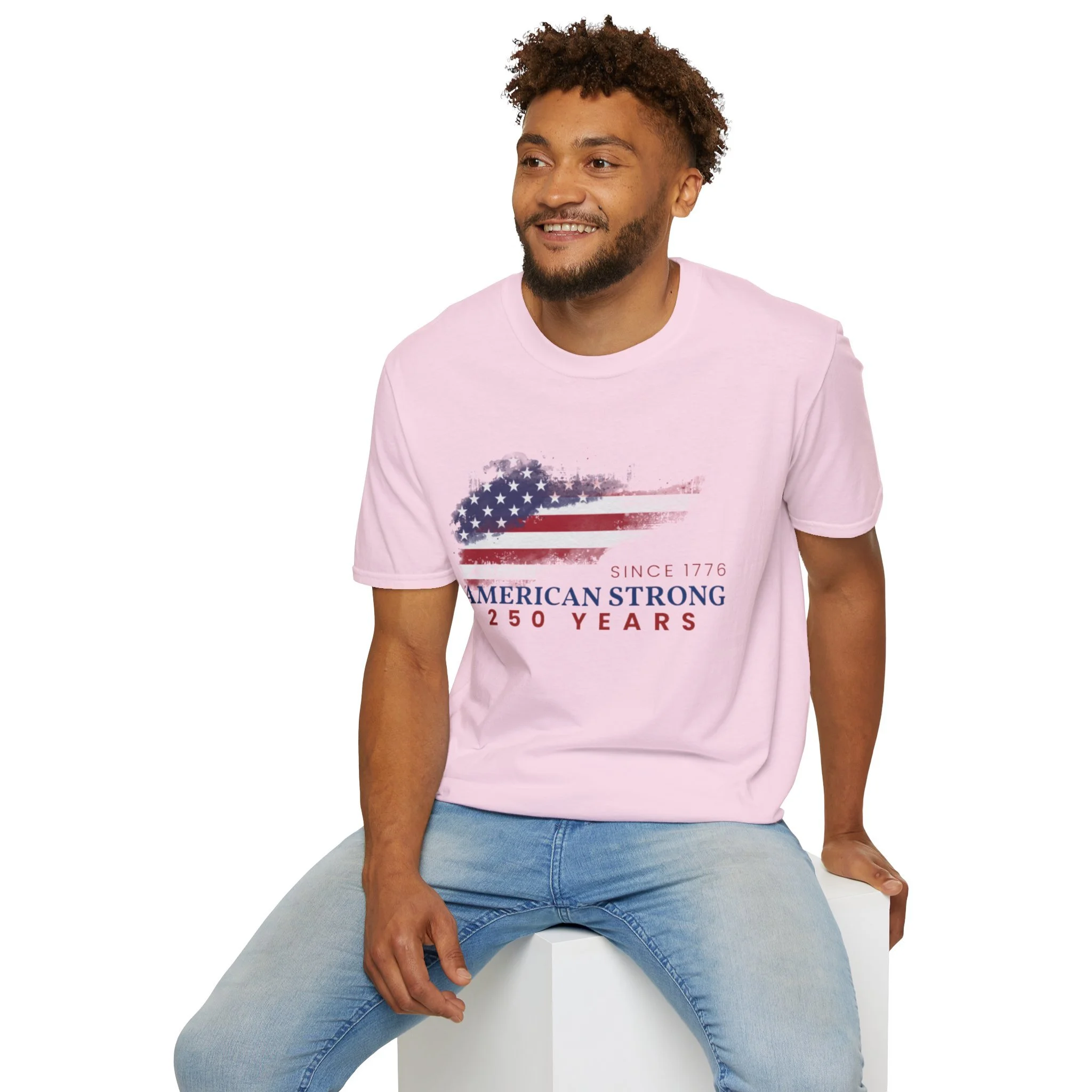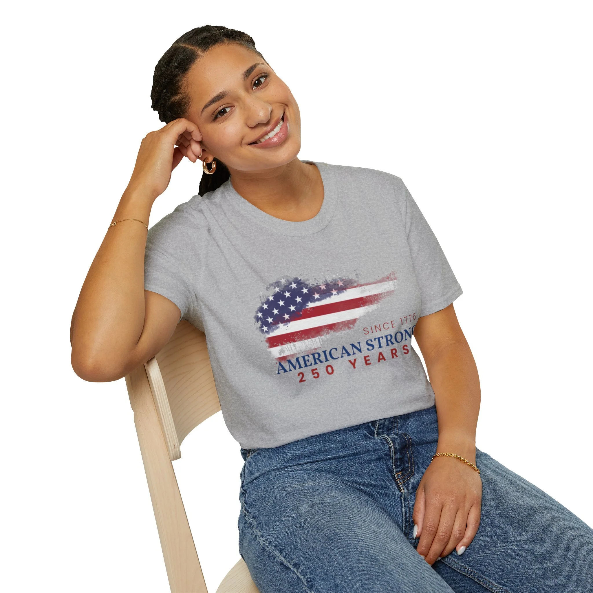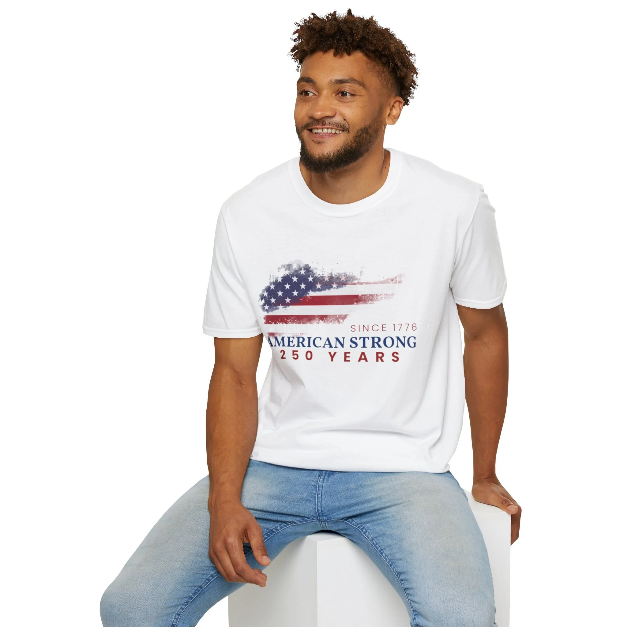 A clean, comfortably worn-in tee that carries a quiet pride. The lightweight ring-spun cotton feels soft against the skin while the distressed American flag graphic and subtle “American Strong — 250 Years” text sit low and honest on the chest. It layers easily under a flannel or wears alone at backyard barbecues, parades, or casual meetups. Breathable and durable, this shirt moves with you and keeps its shape thanks to ribbed collar and reinforced shoulder tape. Every detail — from the tear-away label to the tubular knit — keeps comfort in focus so the message remains the star.