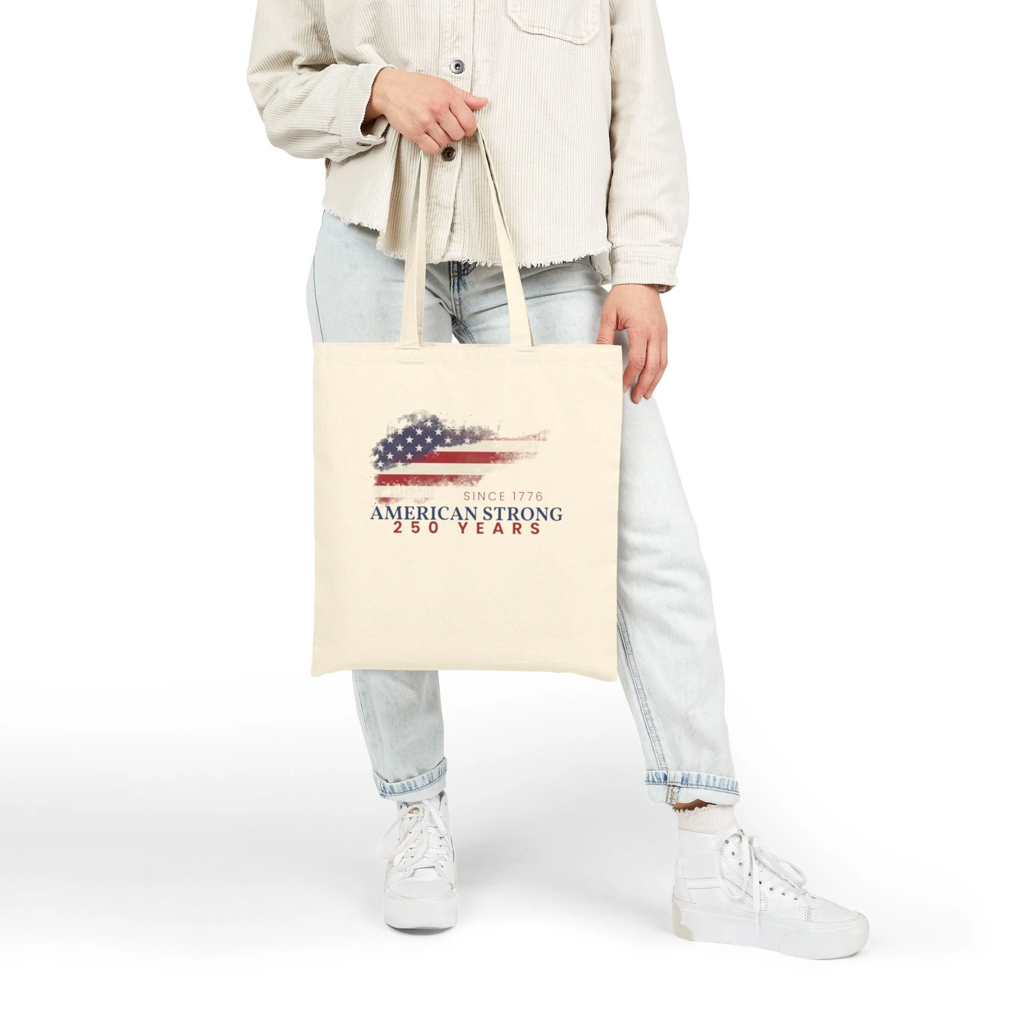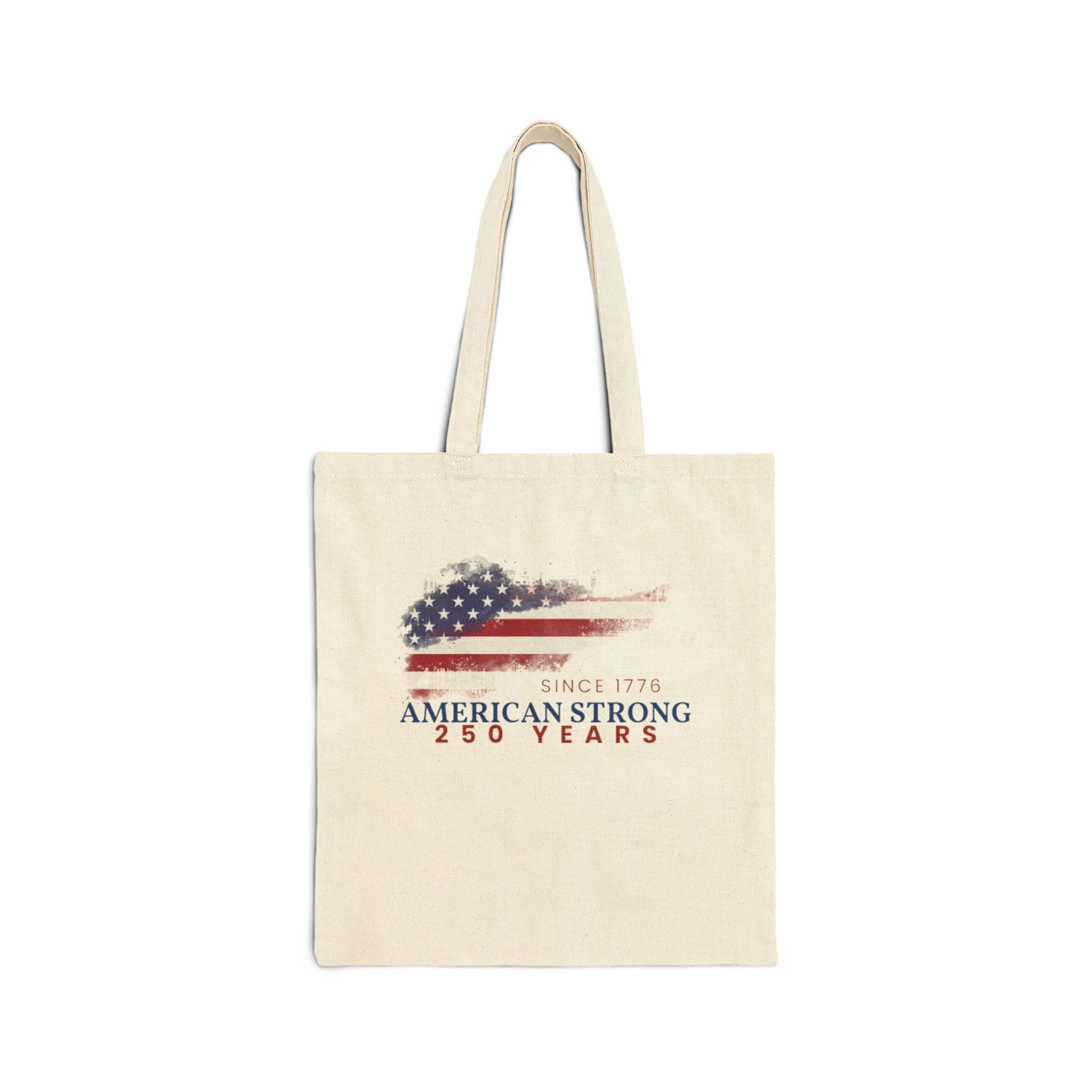A sturdy cotton canvas tote that carries more than errands — it carries a quiet pride. The natural heavy-weight fabric holds shape and weight without sagging, while the flat-corner construction gives a clean, structured silhouette. A subtly distressed American-flag graphic sits low on the front, faded and worn like a well-traveled banner; it reads as lived-in, not loud. Long reinforced handles sit comfortably over the shoulder for market runs, library visits, or a commute day when you want something durable and sincere. Available in natural or black, this tote blends practical strength with an understated vintage spirit.