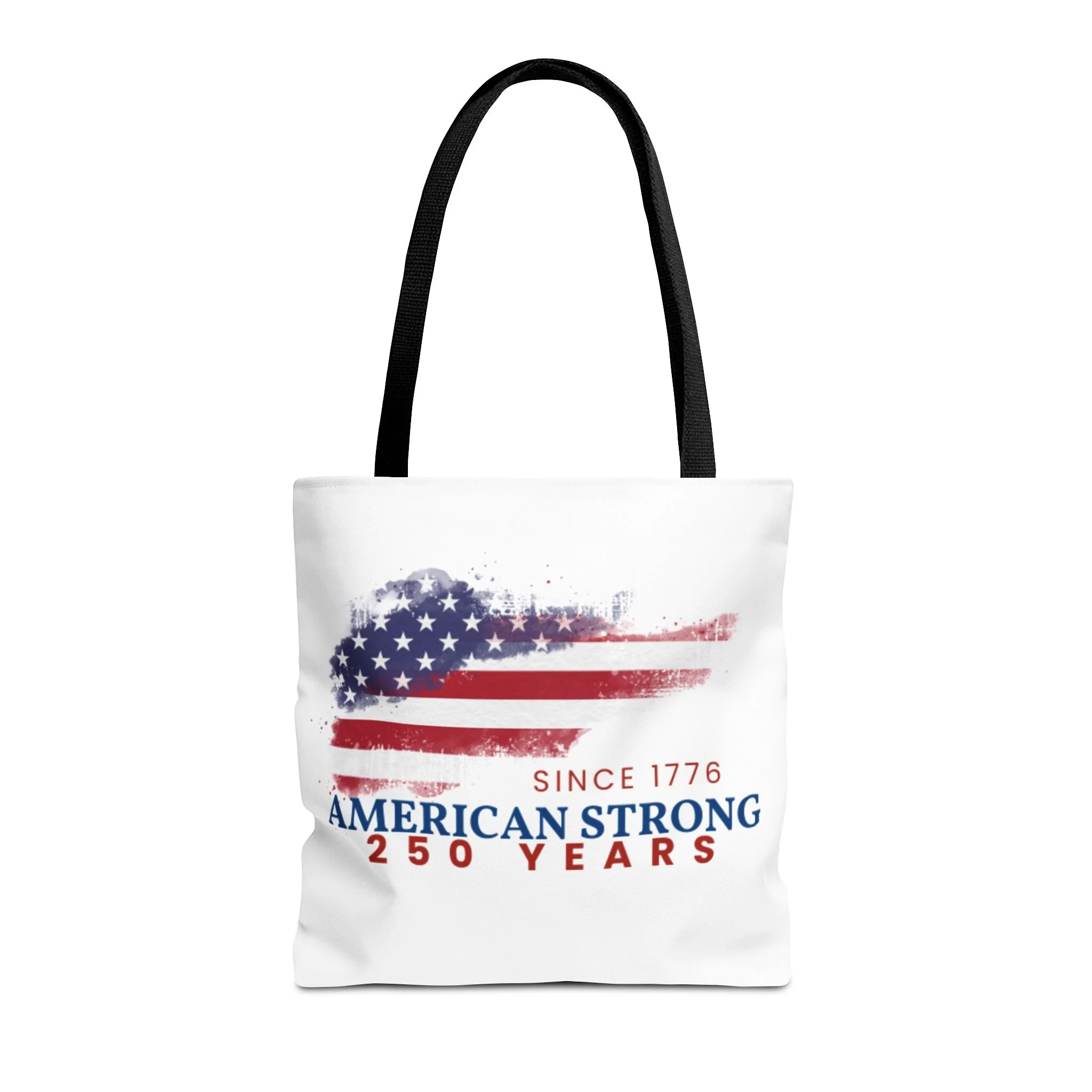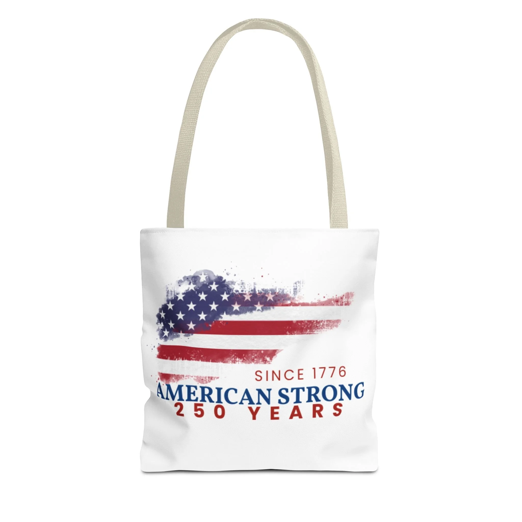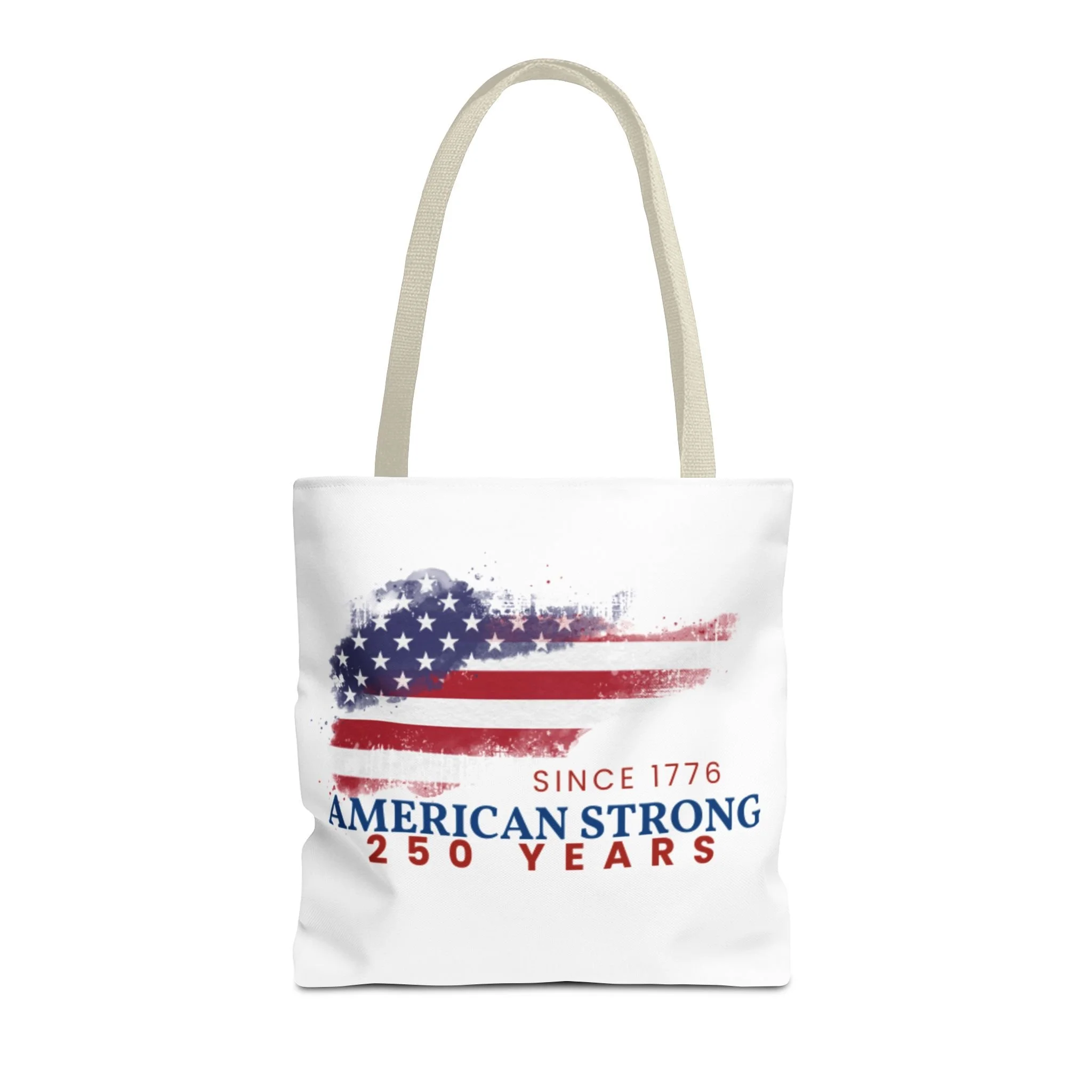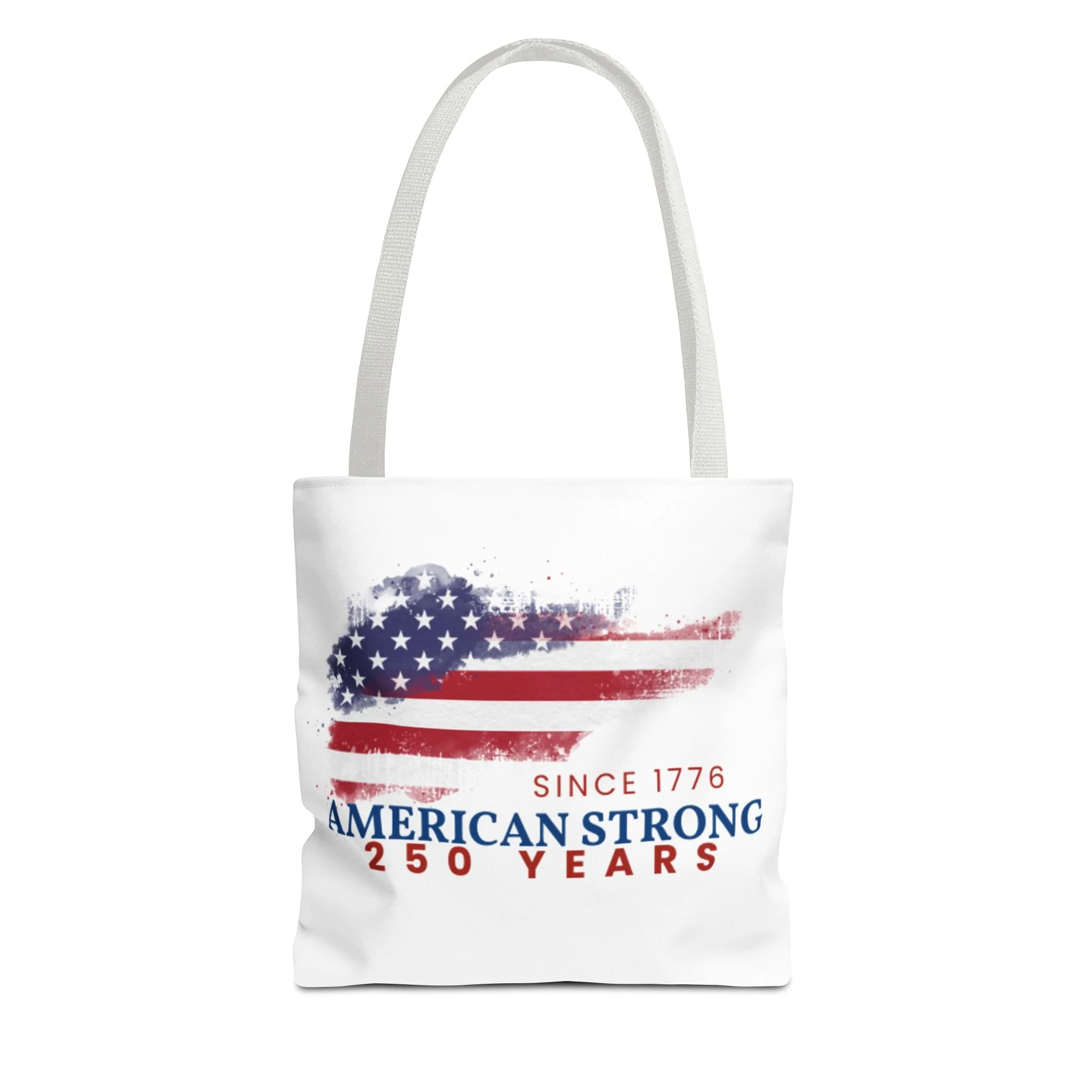 This roomy tote blends rugged durability with a patriotic pulse. A textured, painterly American flag and the bold line “American Strong — 250 Years” sit on a clean white background, giving the bag a lived-in, vintage feel. The medium-weight polyester holds its shape and stands up to daily use, while boxed corners and reinforced handle stitching create extra carrying room and long-lasting strength. Choose from five handle colors to match your style. Bring it to parades, block parties, or everyday errands to carry essentials with quiet pride and a nod to history.