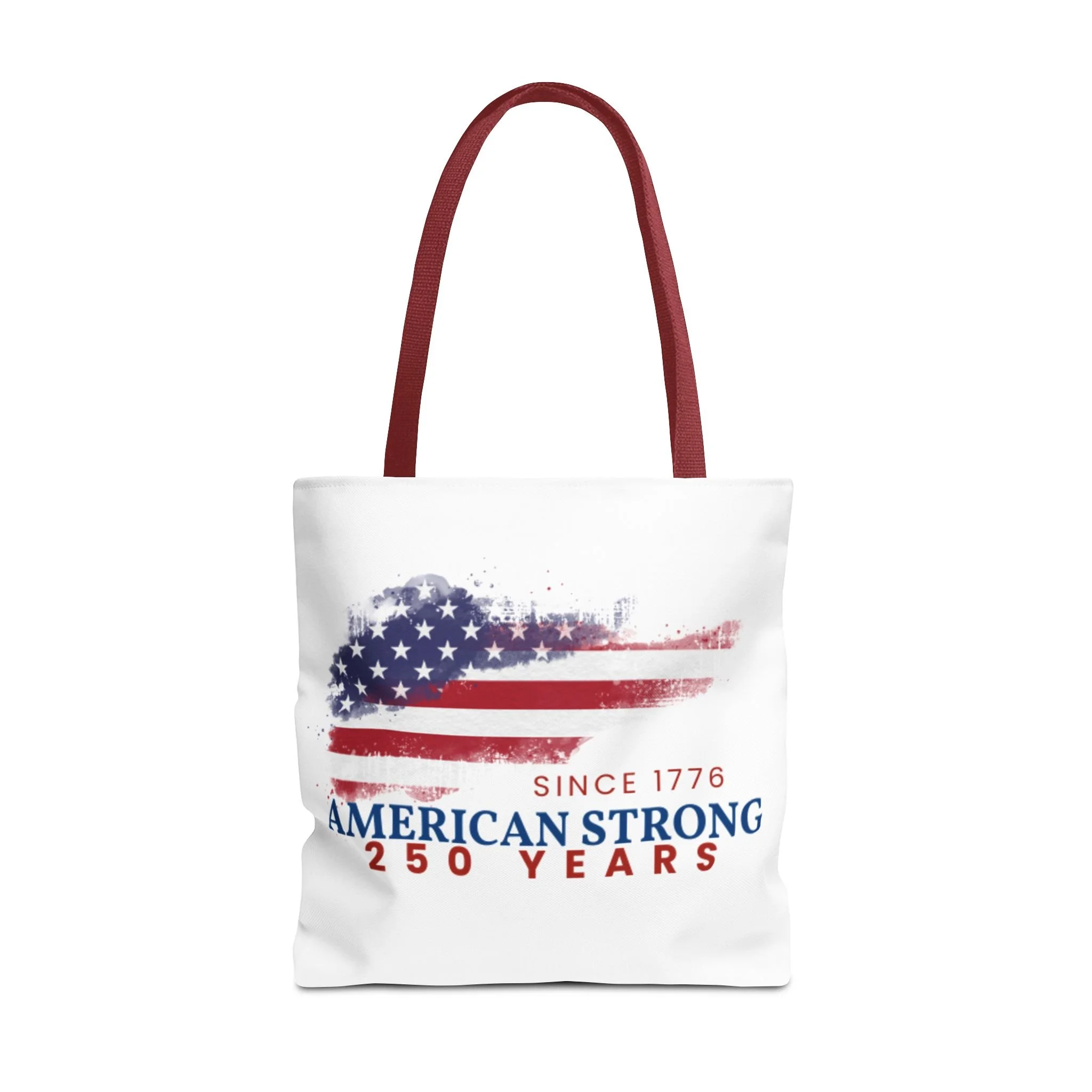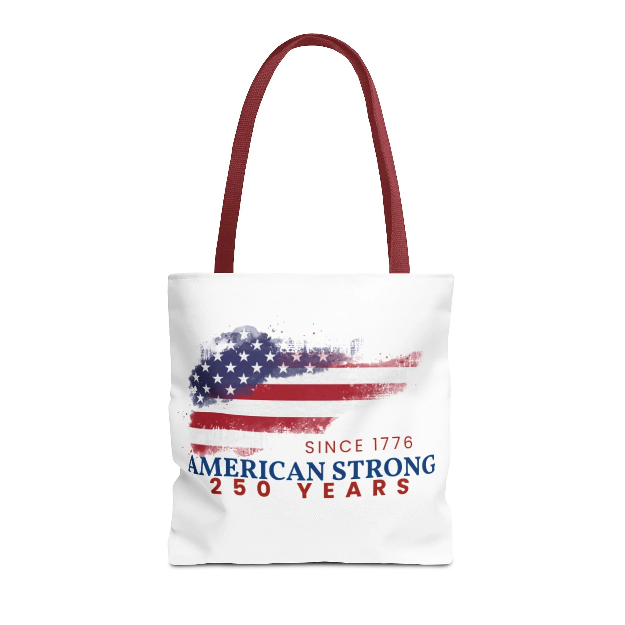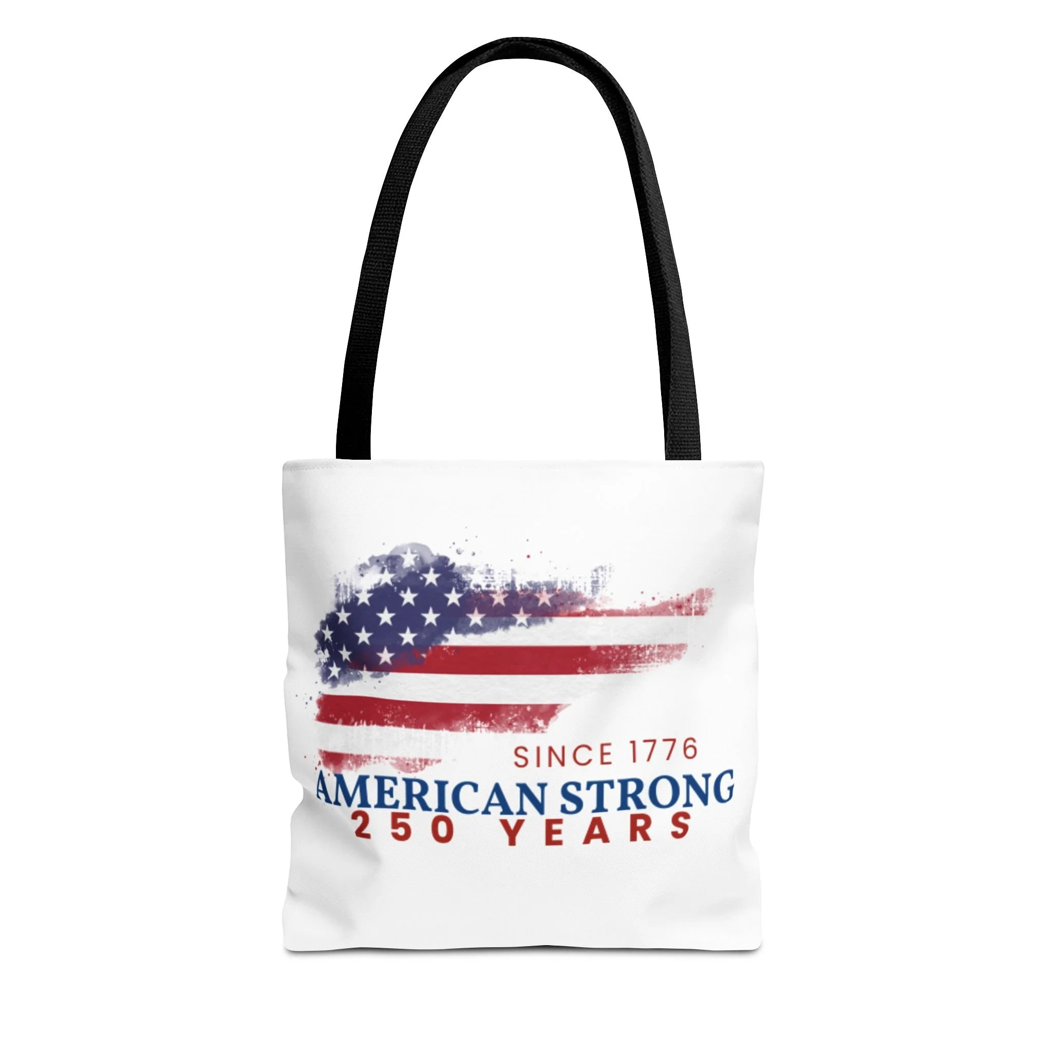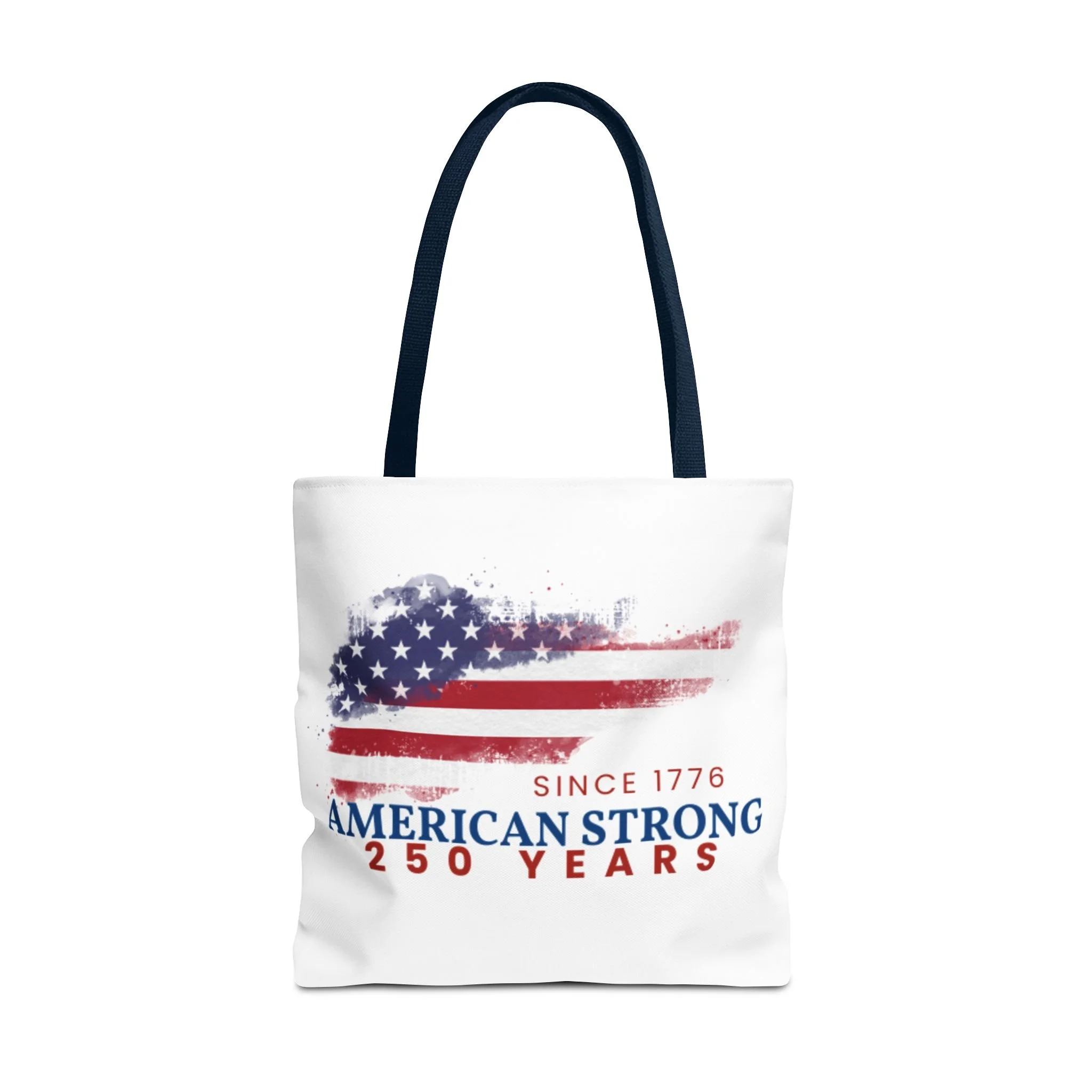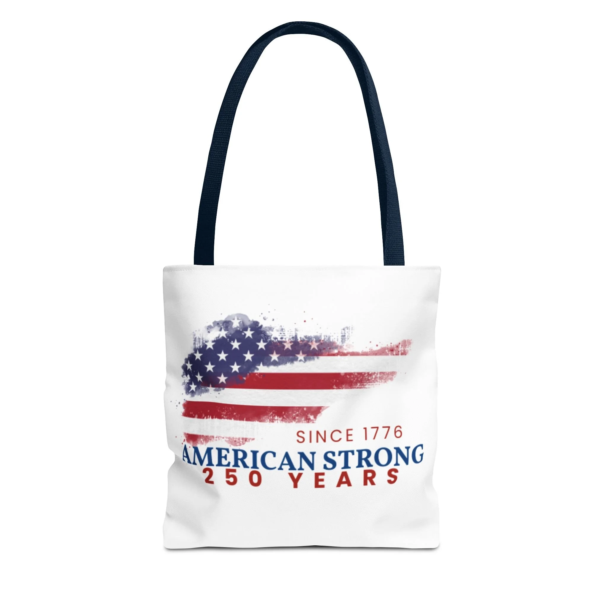 This roomy tote blends rugged durability with a patriotic pulse. A textured, painterly American flag and the bold line “American Strong — 250 Years” sit on a clean white background, giving the bag a lived-in, vintage feel. The medium-weight polyester holds its shape and stands up to daily use, while boxed corners and reinforced handle stitching create extra carrying room and long-lasting strength. Choose from five handle colors to match your style. Bring it to parades, block parties, or everyday errands to carry essentials with quiet pride and a nod to history.