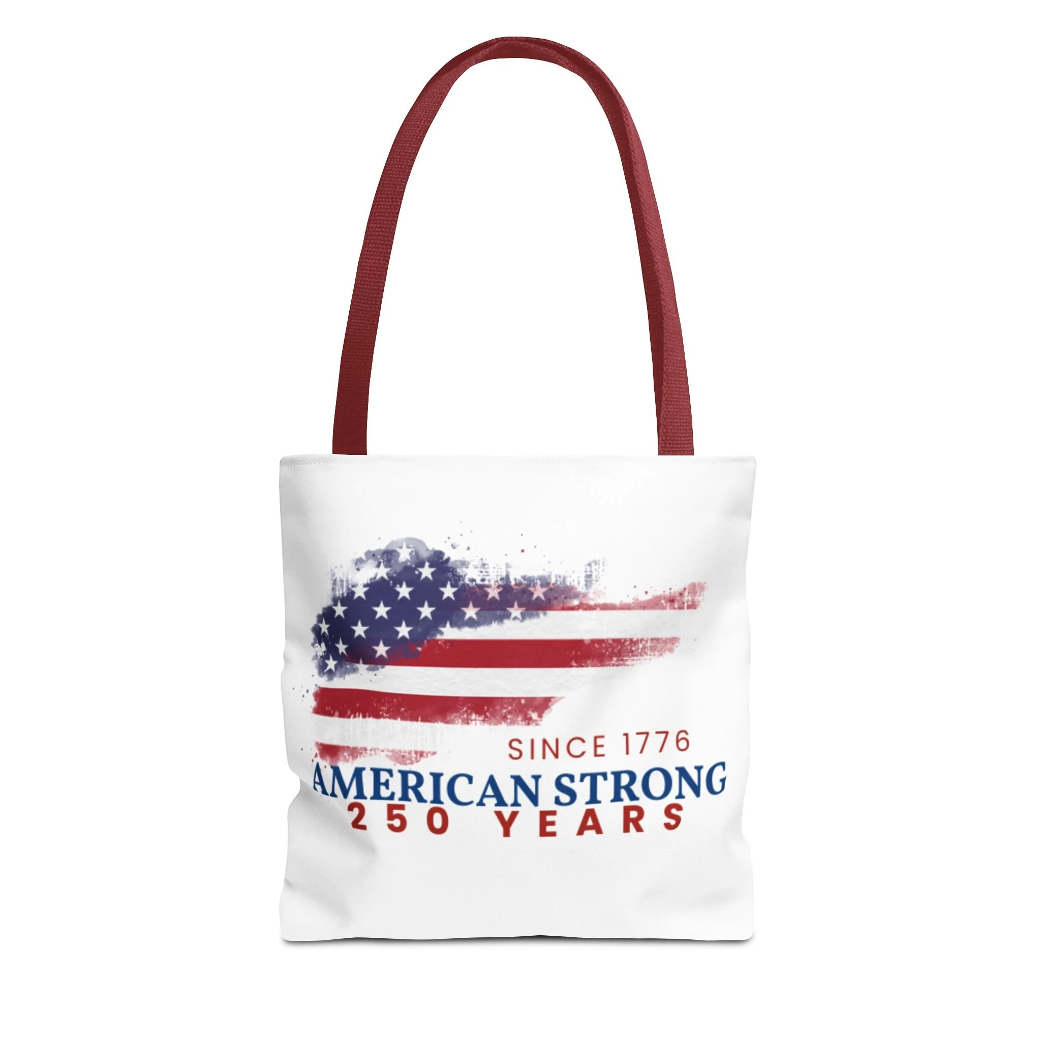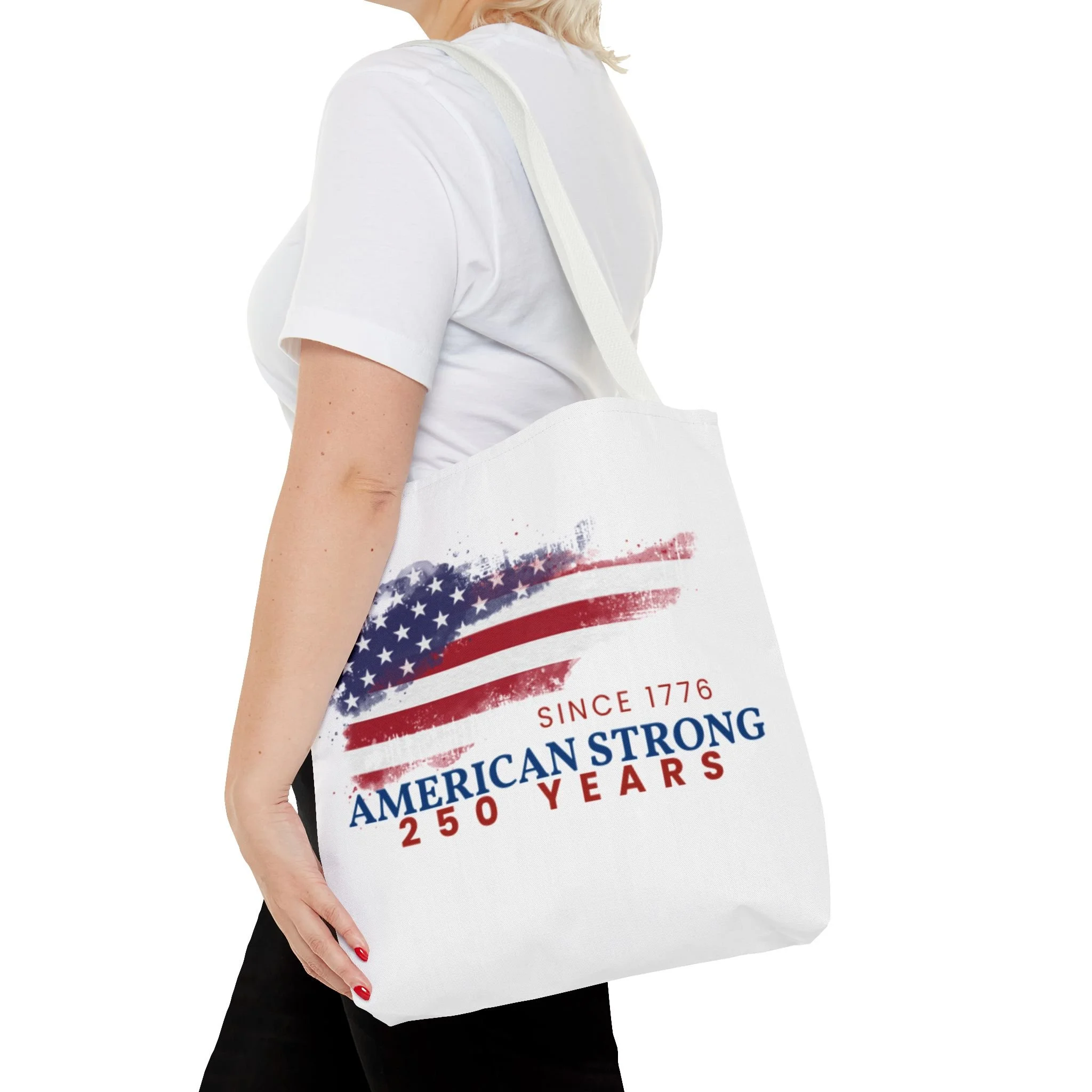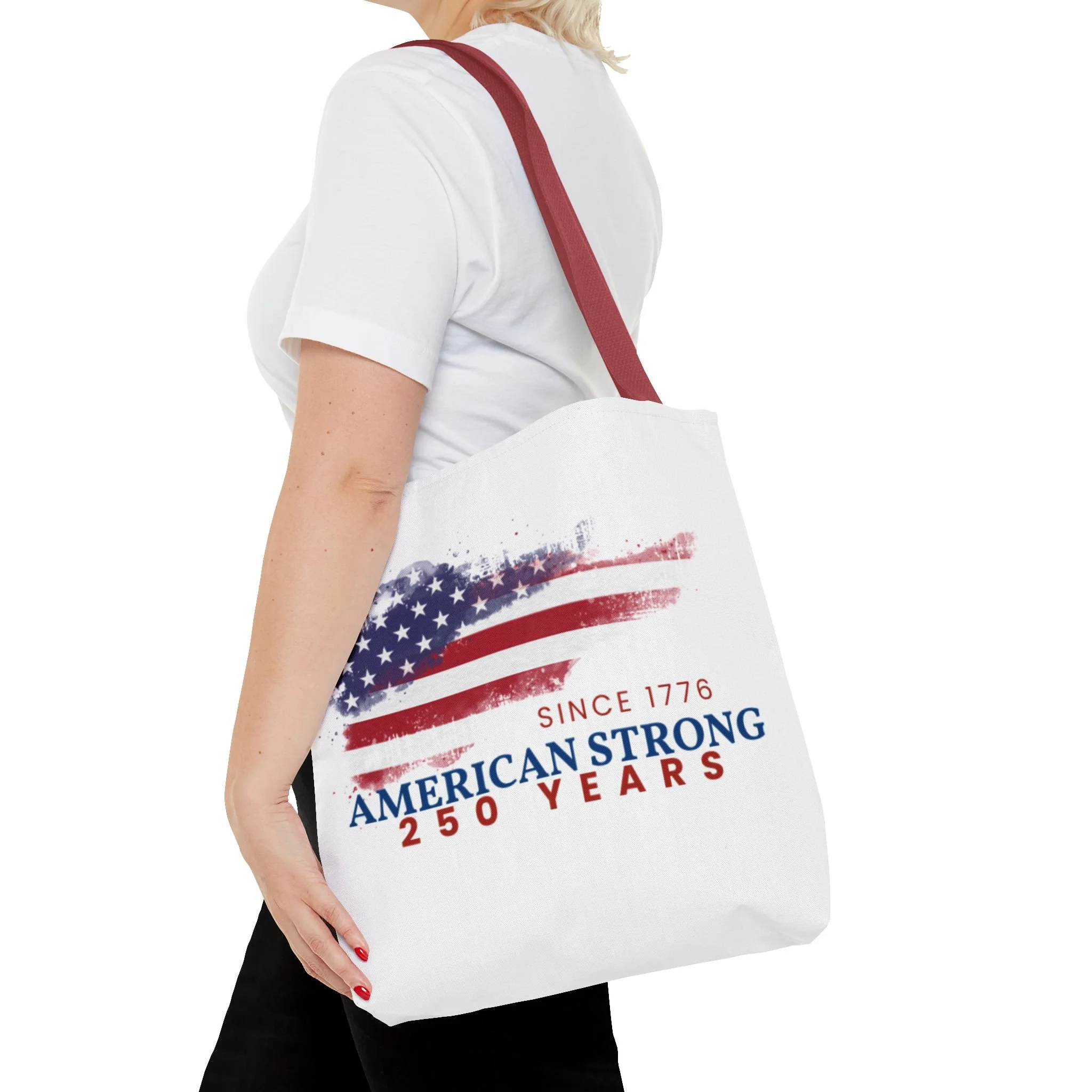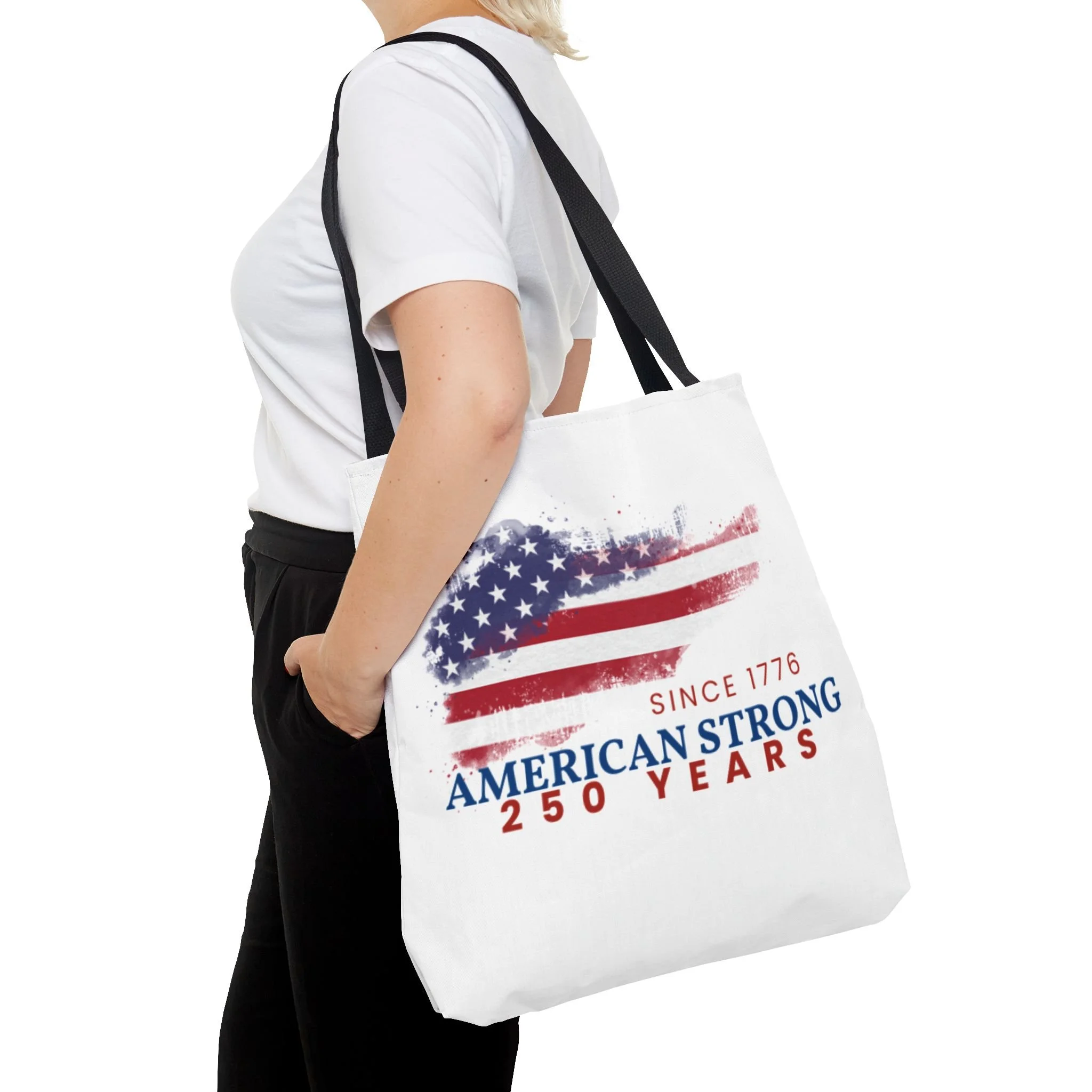 This roomy tote blends rugged durability with a patriotic pulse. A textured, painterly American flag and the bold line “American Strong — 250 Years” sit on a clean white background, giving the bag a lived-in, vintage feel. The medium-weight polyester holds its shape and stands up to daily use, while boxed corners and reinforced handle stitching create extra carrying room and long-lasting strength. Choose from five handle colors to match your style. Bring it to parades, block parties, or everyday errands to carry essentials with quiet pride and a nod to history.
