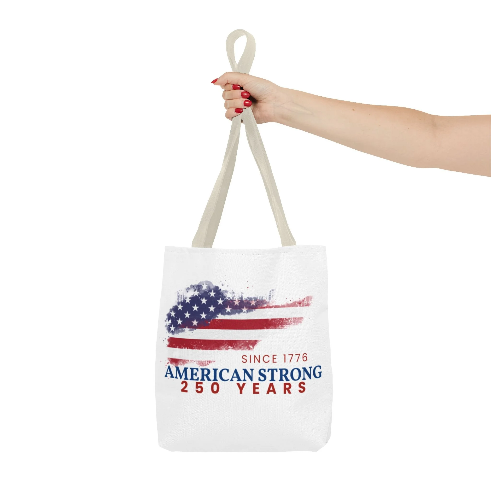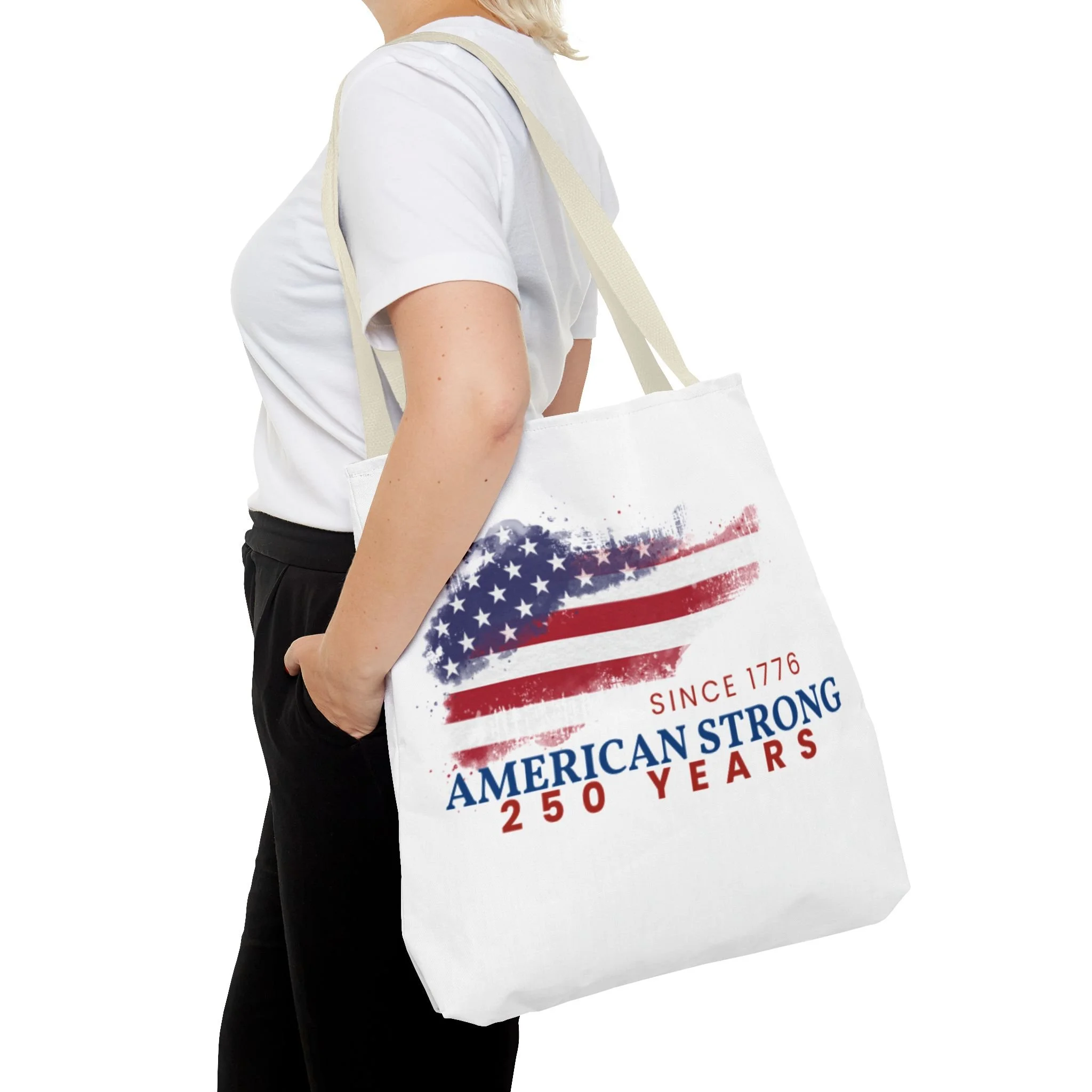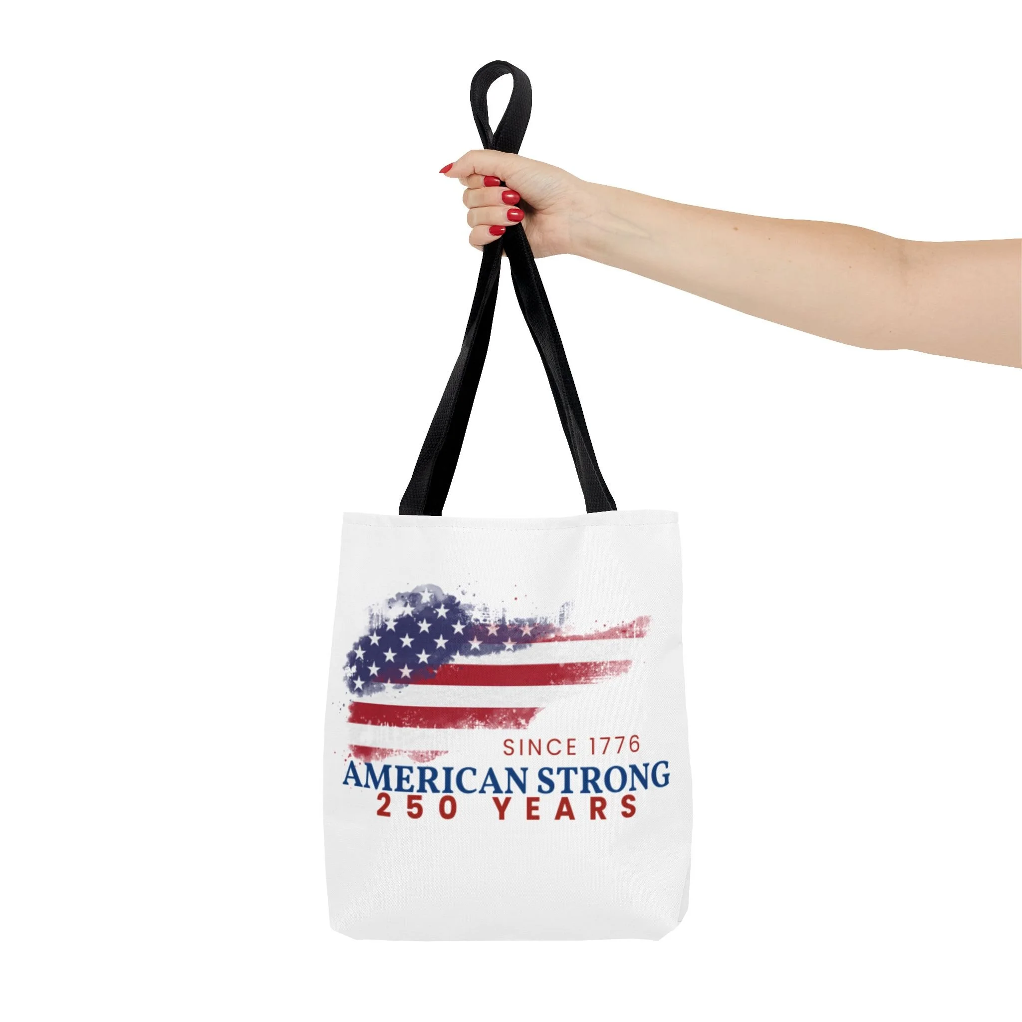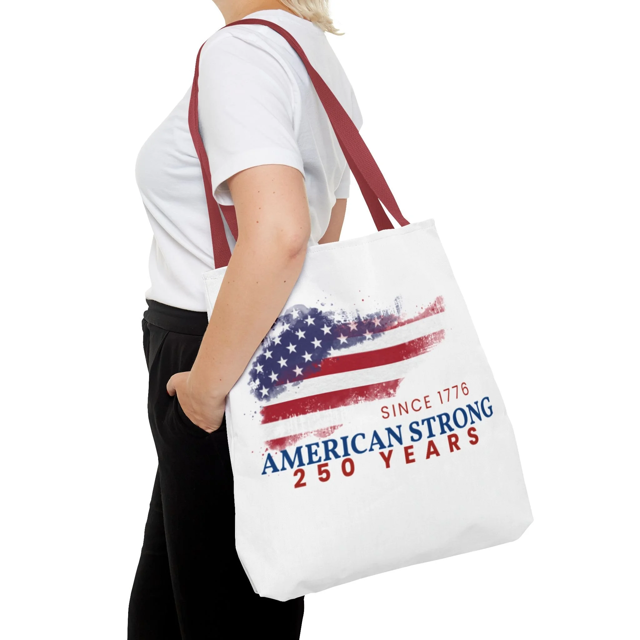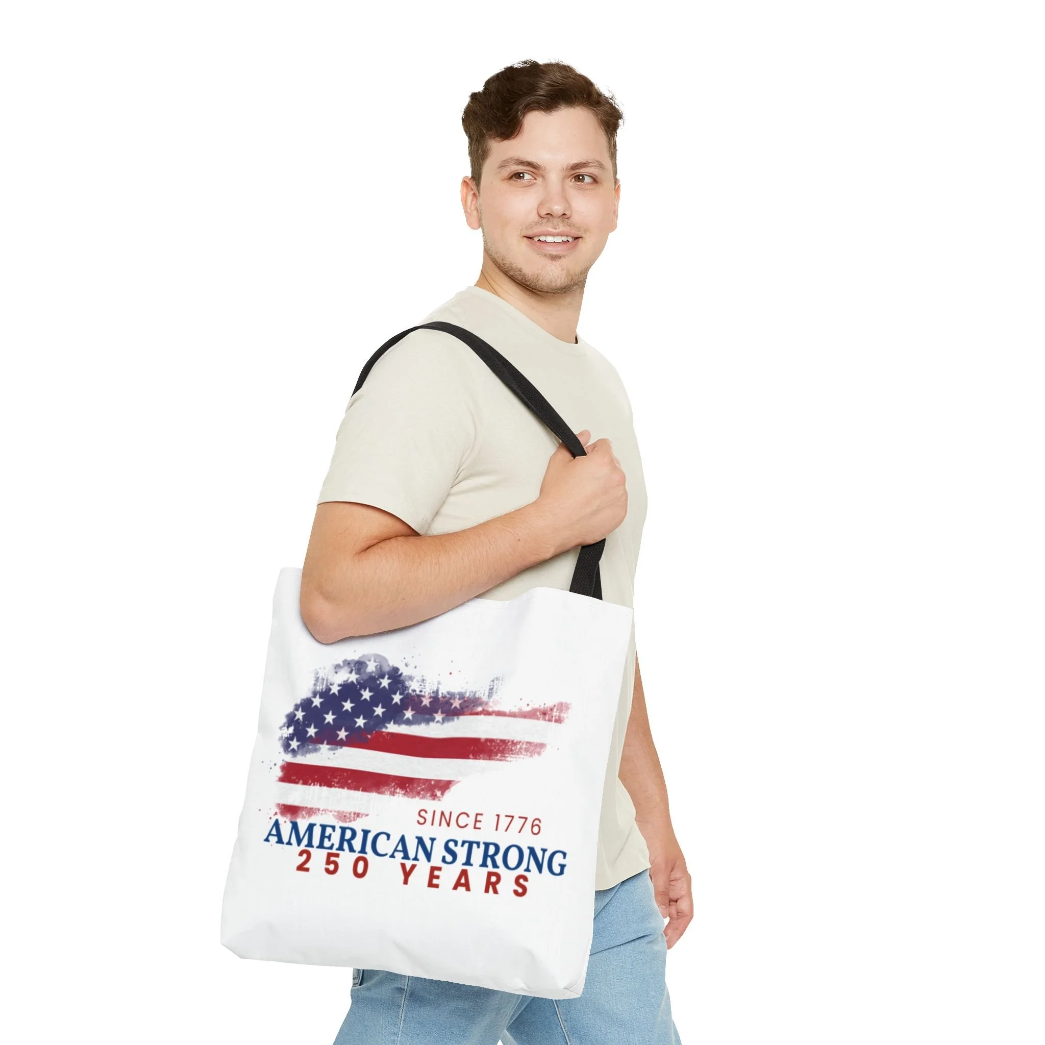 This roomy tote blends rugged durability with a patriotic pulse. A textured, painterly American flag and the bold line “American Strong — 250 Years” sit on a clean white background, giving the bag a lived-in, vintage feel. The medium-weight polyester holds its shape and stands up to daily use, while boxed corners and reinforced handle stitching create extra carrying room and long-lasting strength. Choose from five handle colors to match your style. Bring it to parades, block parties, or everyday errands to carry essentials with quiet pride and a nod to history.