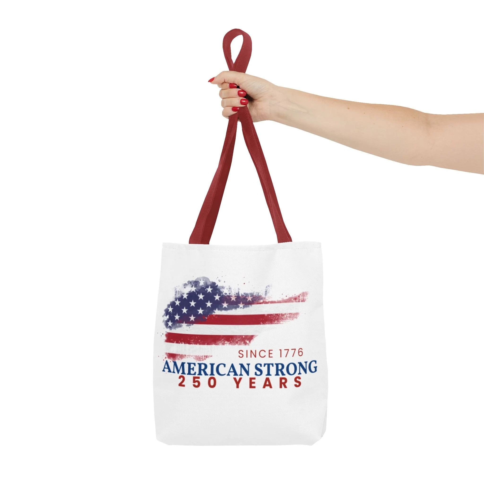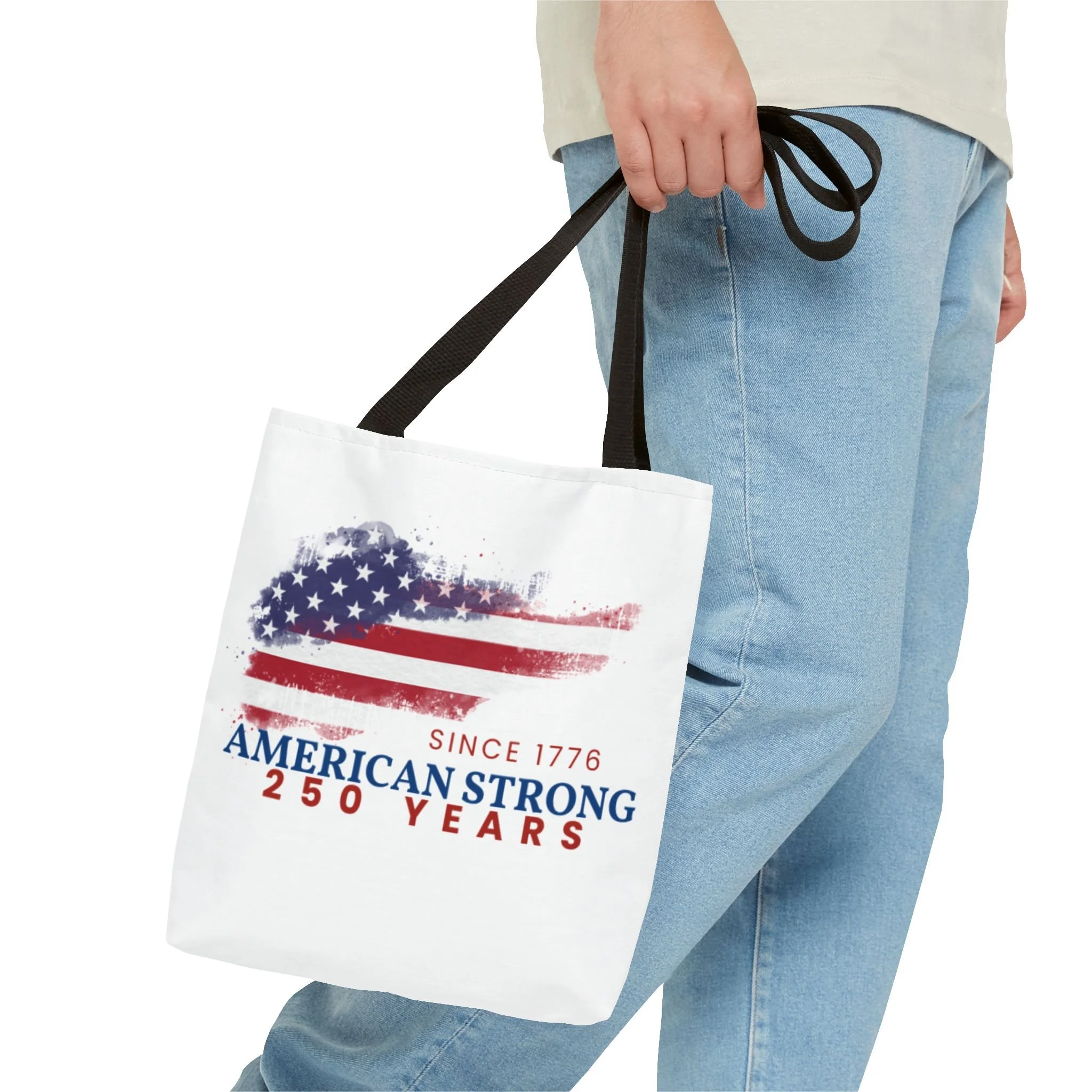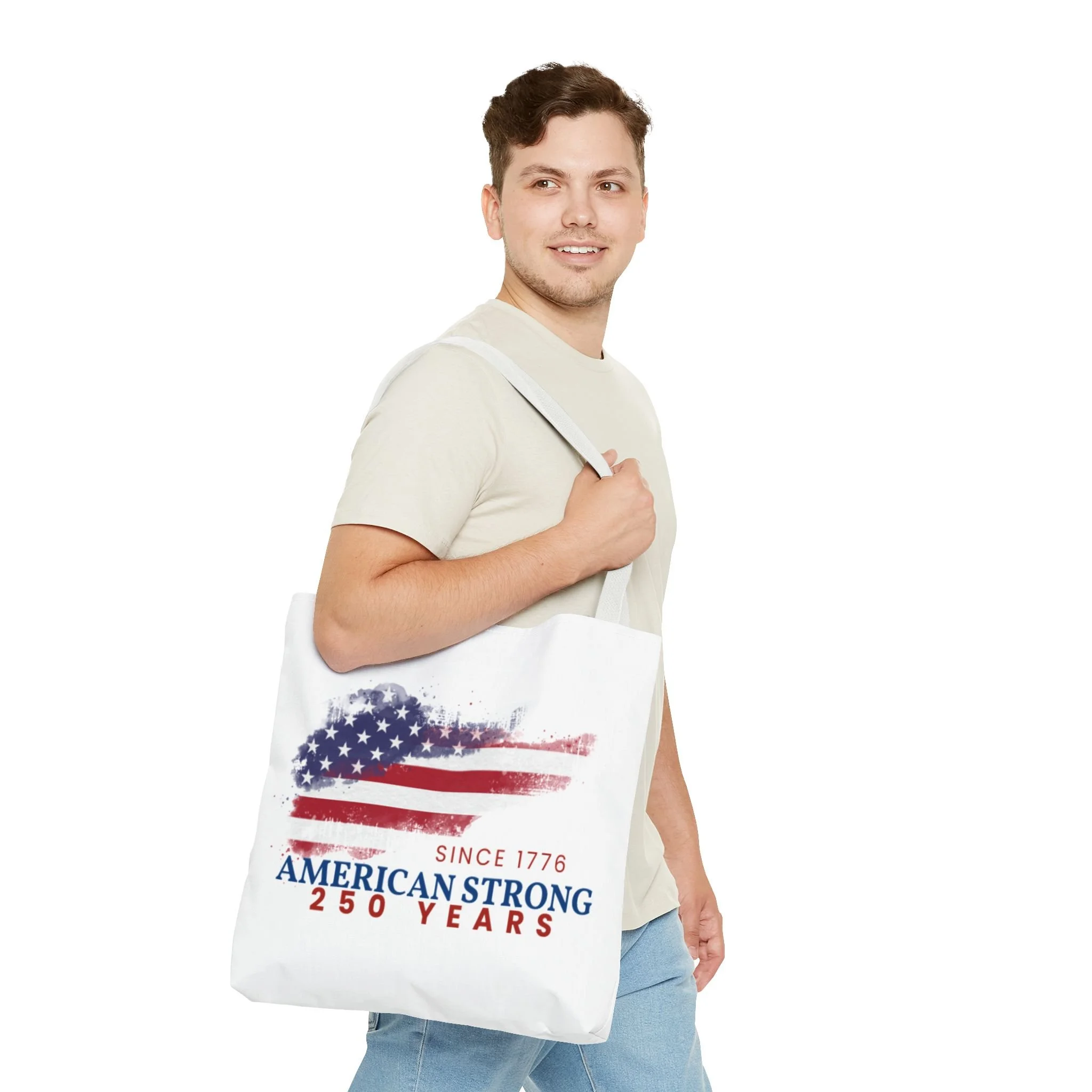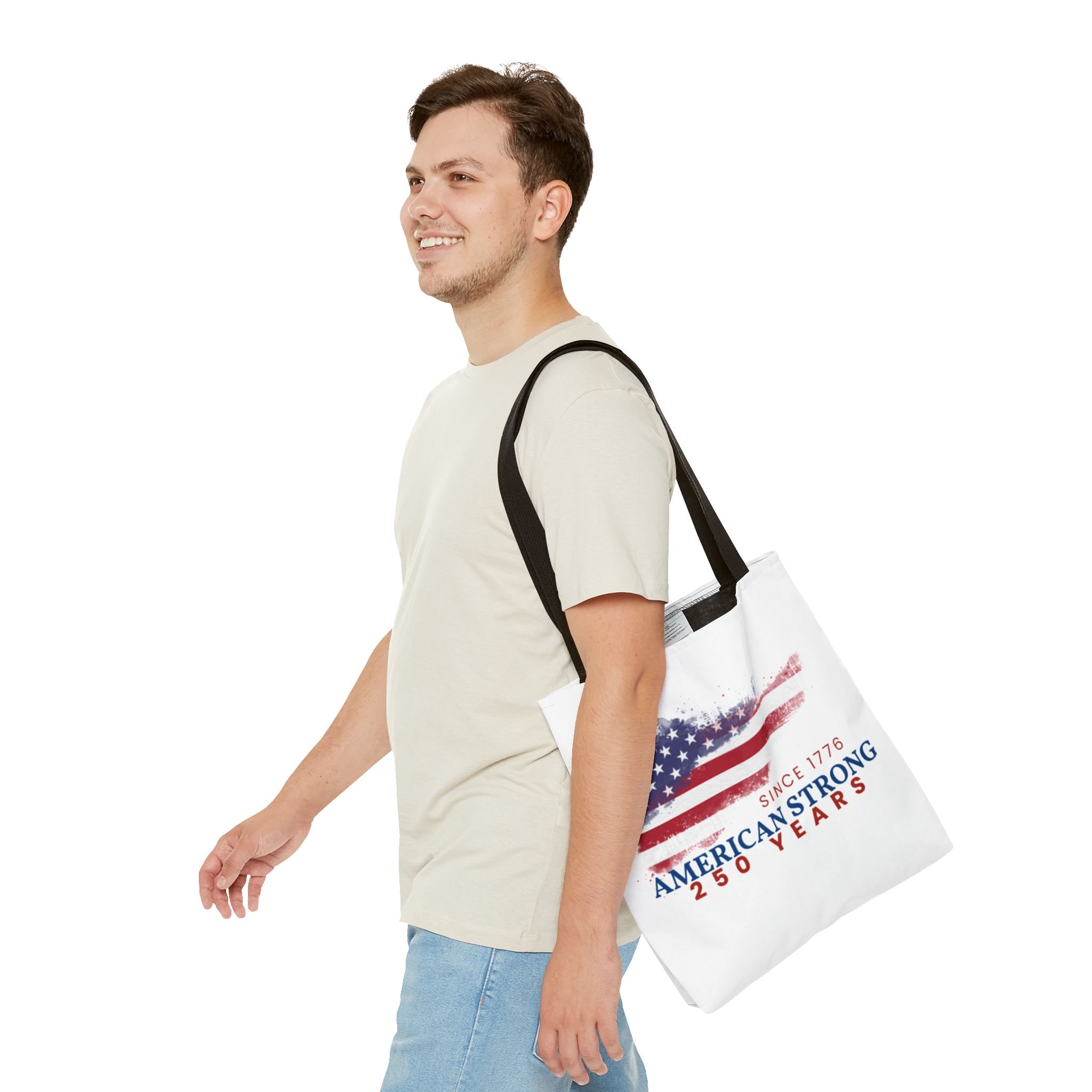 This roomy tote blends rugged durability with a patriotic pulse. A textured, painterly American flag and the bold line “American Strong — 250 Years” sit on a clean white background, giving the bag a lived-in, vintage feel. The medium-weight polyester holds its shape and stands up to daily use, while boxed corners and reinforced handle stitching create extra carrying room and long-lasting strength. Choose from five handle colors to match your style. Bring it to parades, block parties, or everyday errands to carry essentials with quiet pride and a nod to history.