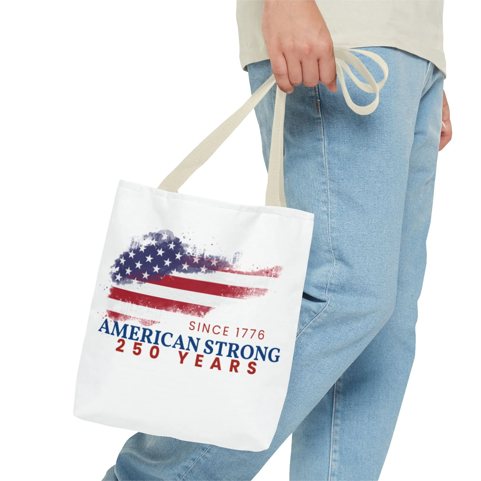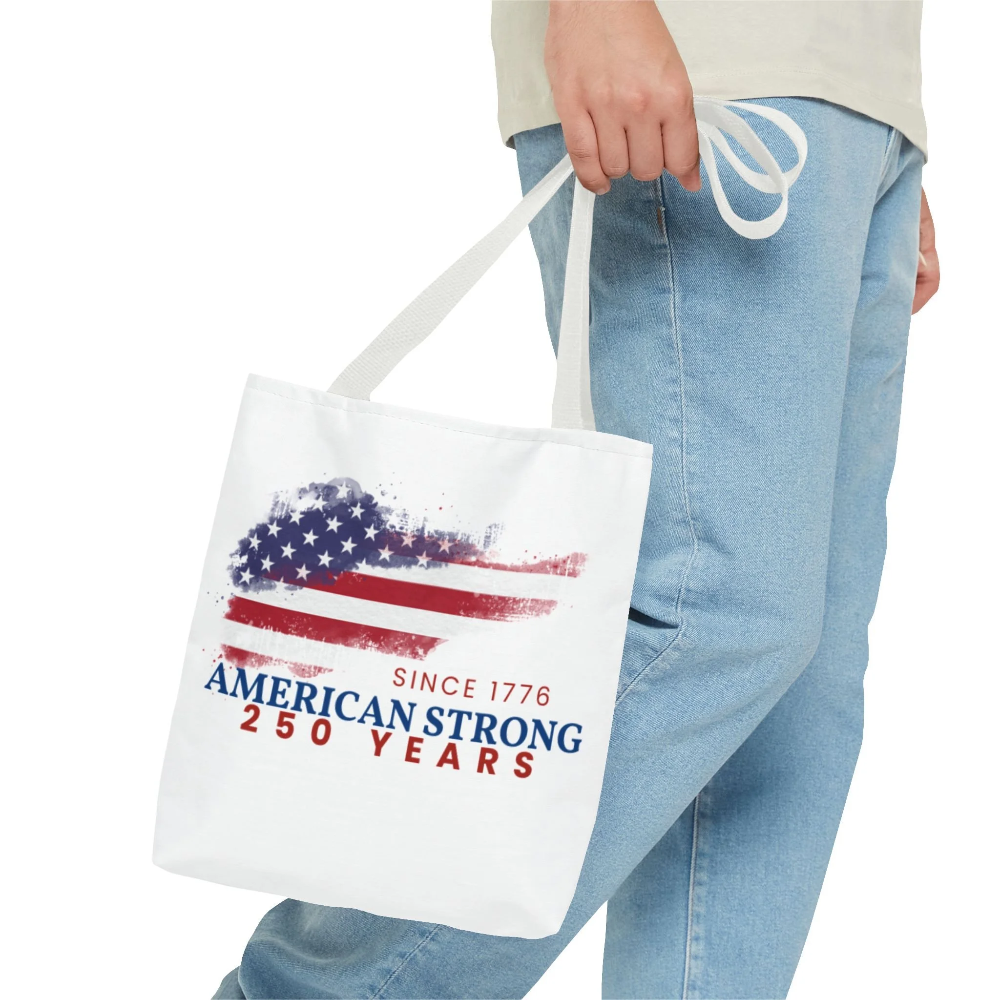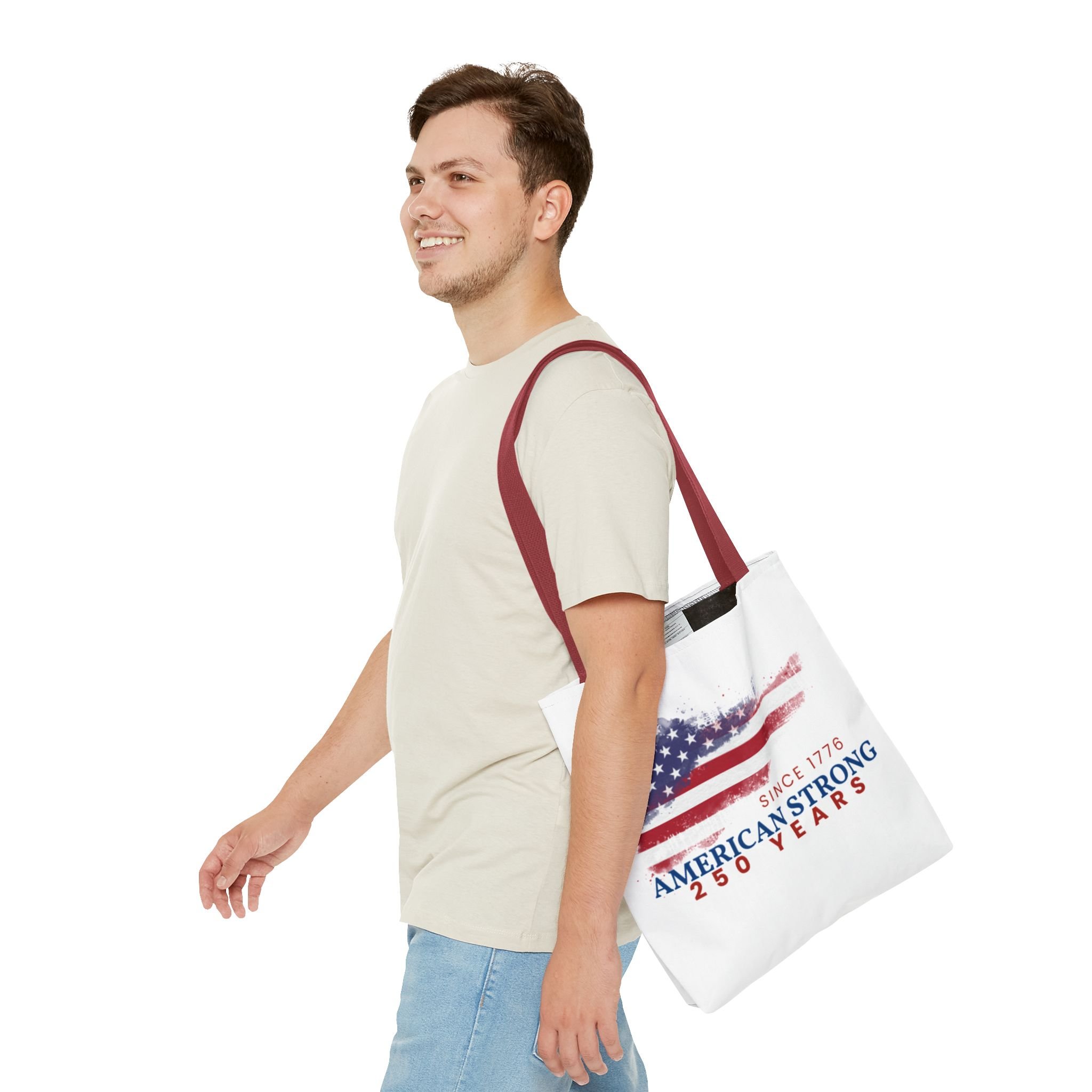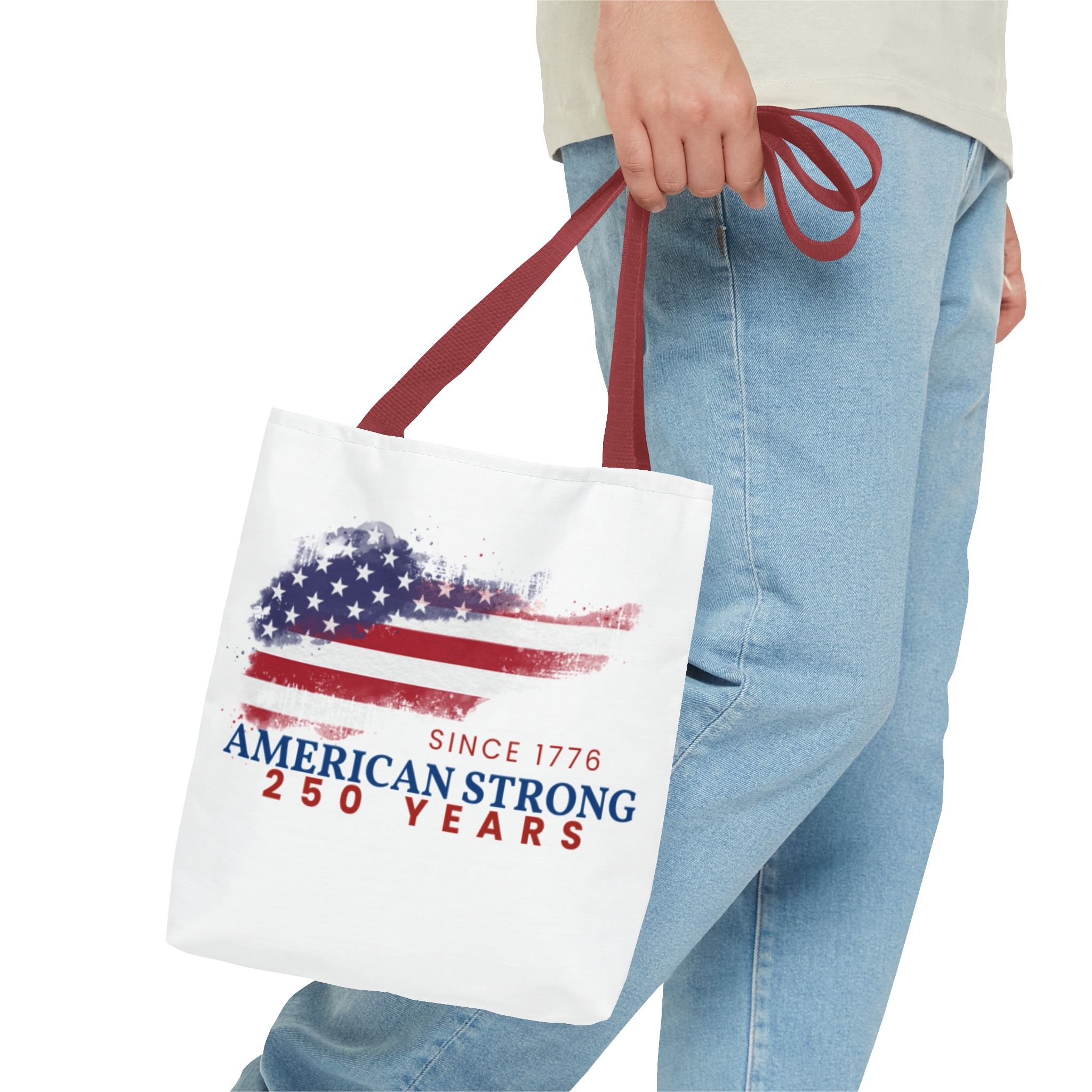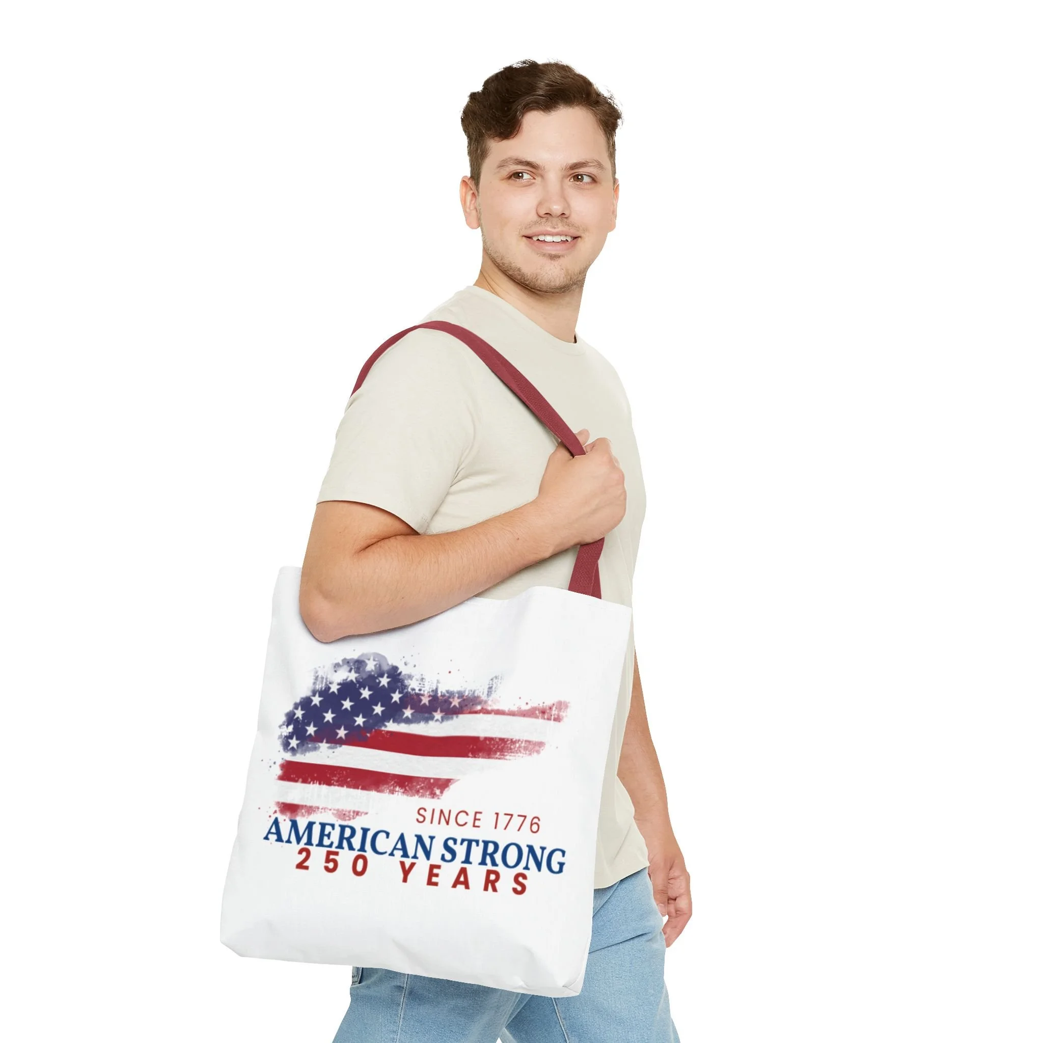 This roomy tote blends rugged durability with a patriotic pulse. A textured, painterly American flag and the bold line “American Strong — 250 Years” sit on a clean white background, giving the bag a lived-in, vintage feel. The medium-weight polyester holds its shape and stands up to daily use, while boxed corners and reinforced handle stitching create extra carrying room and long-lasting strength. Choose from five handle colors to match your style. Bring it to parades, block parties, or everyday errands to carry essentials with quiet pride and a nod to history.